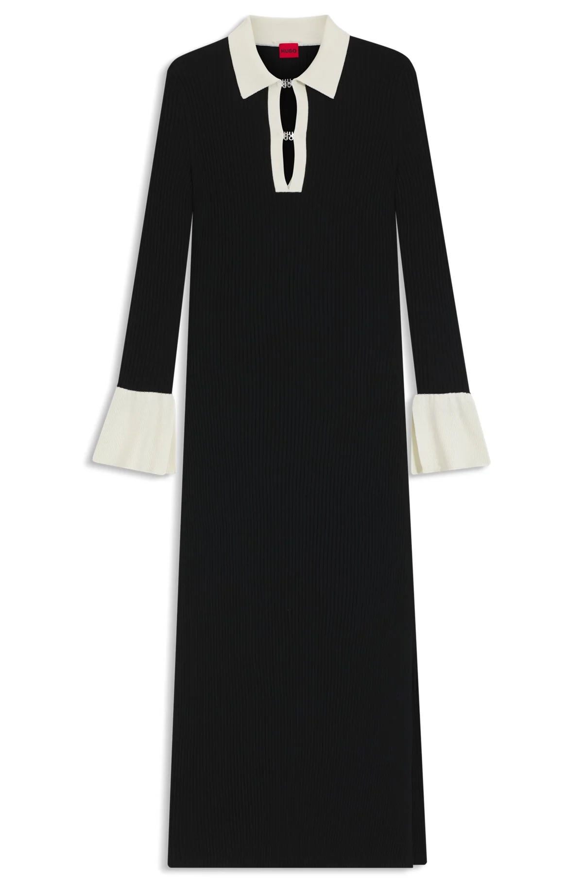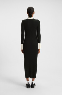 DETAILS Sharry - 50542620 With a ribbed, bodycon fit offset by voluminous cuffs, this knitted HUGO Womenswear dress creates a flattering effect. Stacked-logo charms at the keyhole placket. Fit back length: 125 cm (49 inches) QUALITY & CARE INSTRUCTIONS Dry Clean Only Do Not Bleach Iron Low Heat Cold, gentle machine wash; reduced spin speed. Quality: 76% Viscose, 24% Polyamid Do Not Tumble Dry