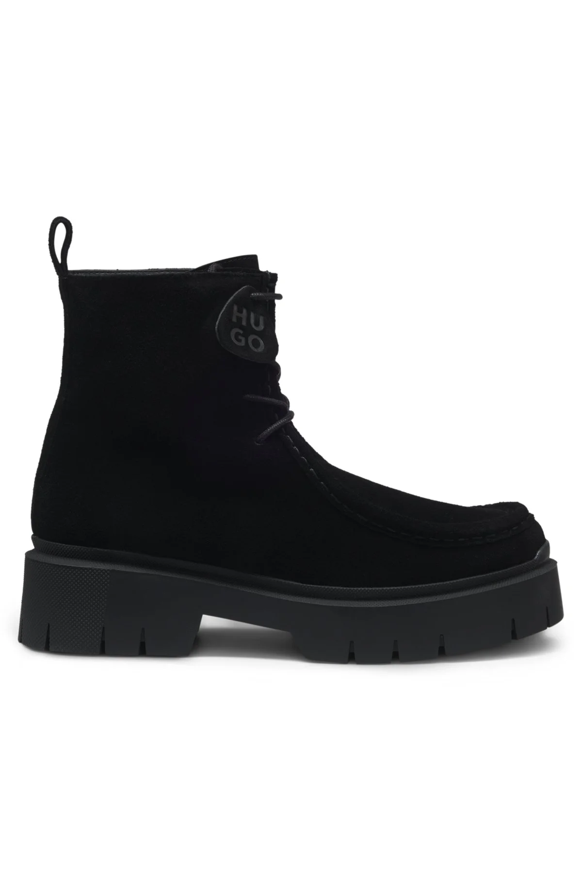 DETAILS Add a modern finish to everyday looks with the suede uppers and chunky outsole of these HUGO Womenswear boots. Detachable logo tag for versatile styling. Fastening top: Slip-on Laces Sole: Other material Packaging: Box Kris_DrbBootie_SD - 50552733 QUALITY & CARE INSTRUCTIONS Upper material: 100% Cow leather, Lining: 60% Polyester, 40% Polyurethane, Sole: 100% Synthetic rubber, Innersole: 60% Polyester, 40% Polyurethane