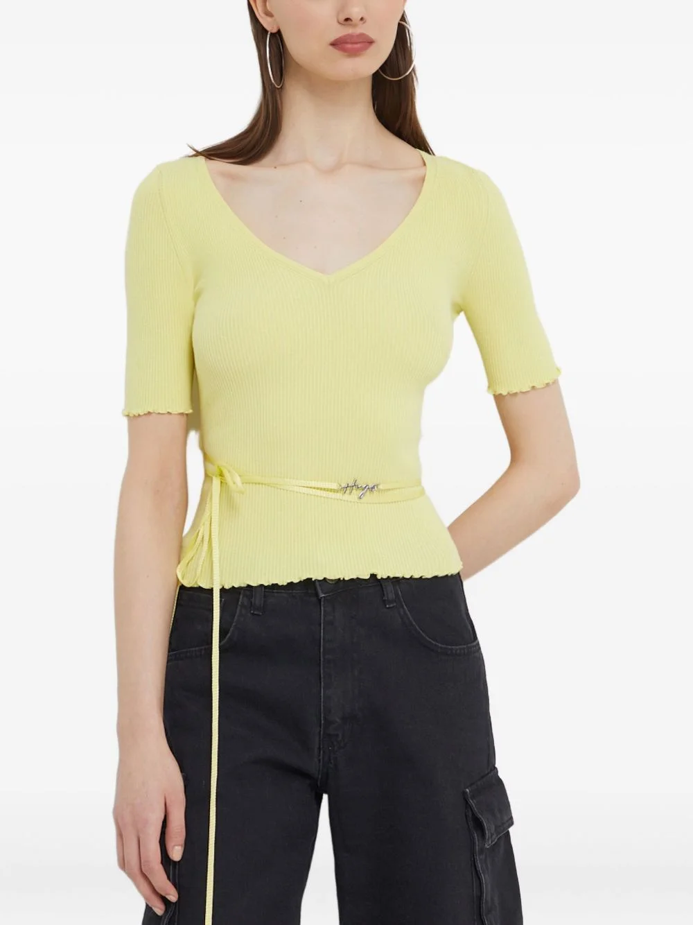 lettuce-trim tied-waist top Highlights - Light yellow - Ribbed knit - V-neck - Short sleeves - Lettuce hem - Tie detail Imported Composition Viscose 70%, Polyester 30% Washing instructions Read Manufacturer Guidelines