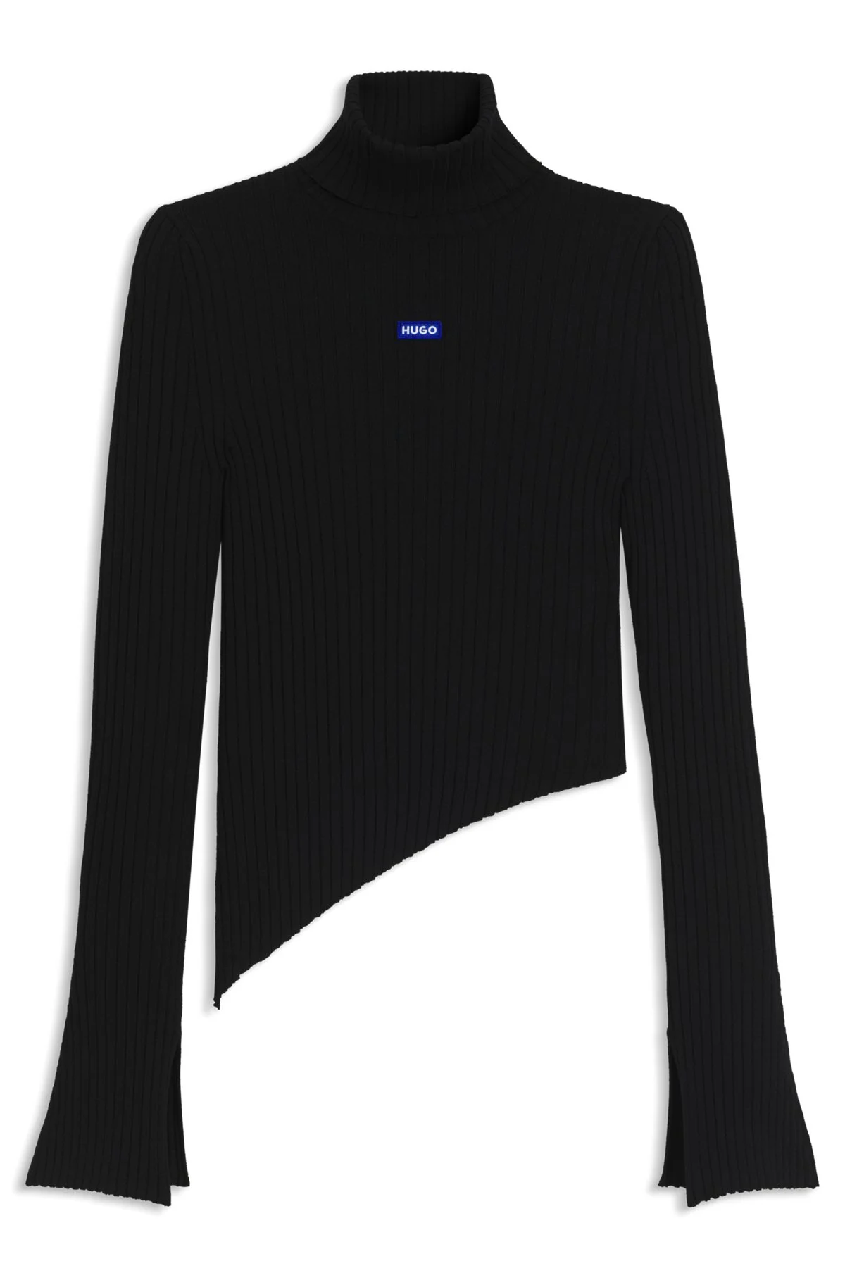 SIZE AND FIT The model wears a size S and is 5'10" tall with a, 32" chest, 24" waist and 35" hips. DETAILS Create a variety of modern looks with this form-fitting HUGO Womenswear sweater. Rollneck profile with unique asymmetric hemline. Soft ribbed structure. Blue logo badge. Slim fit Neckline: Turtleneck Long sleeves Somyna_B - 50548163 QUALITY & CARE INSTRUCTIONS Quality: 55% Viscose, 43% Polyamid, 2% Elastane Hand Wash Only Do Not Bleach Do Not Dry Clean Iron Low Heat Do Not Tumble Dry