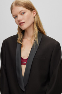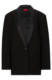 SIZE AND FIT The model wears a size 4 and is 5'10" tall with a, 31" chest, 24" waist and 34" hips. DETAILS Amusar - 50498171 A single-button jacket cut to an oversize fit with wide shoulders, signature lining and shawl lapels for occasion-ready style by HUGO Womenswear. This product is made with cellulose fibers, derived from natural raw wood material and sourced from managed forests. Oversized fit Shawl collar Fastening top: Button closure Number of buttons: 1 Welt chest pockets Pockets top: Welt pockets Button cuffs No vent Fully lined Fit back length: 73 cm (29 inches) QUALITY & CARE INSTRUCTIONS Quality: 79% Viscose, 18% Polyester, 3% Elastane, Lining: 50% Viscose, 50% Polyester, Collar: 100% Polyester, Sleeve lining: 64% Viscose, 36% Polyester Iron Low Heat Do Not Tumble Dry Reduced Dry Clean Do Not Wash Do Not Bleach
