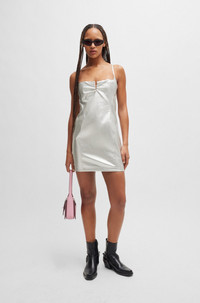 SIZE AND FIT The model wears a size 4 and is 5'9" tall with a, 31" chest, 24" waist and 35" hips. DETAILS Kateresa-1 - 50510432 A party-ready dress with slender straps by HUGO Womenswear, crafted in metallic synthetic coated fabric with a notch detail on the neckline. Synthetic coated fabric, sometimes referred to as faux leather, is a fabric designed to resemble real leather, and/or display a matte, glossy, smooth, or textured, coated appearance. Slim fit Fastening top: Zip closure Sleeveless No cuffs No vent Unlined Fit back length: 89 cm (35 inches) QUALITY & CARE INSTRUCTIONS Quality: 100% Polyester Do Not Iron Reduced Dry Clean Do Not Bleach Cold, gentle machine wash; reduced spin speed. Do Not Tumble Dry