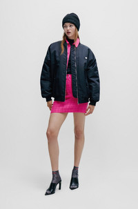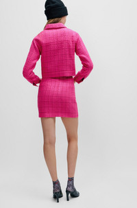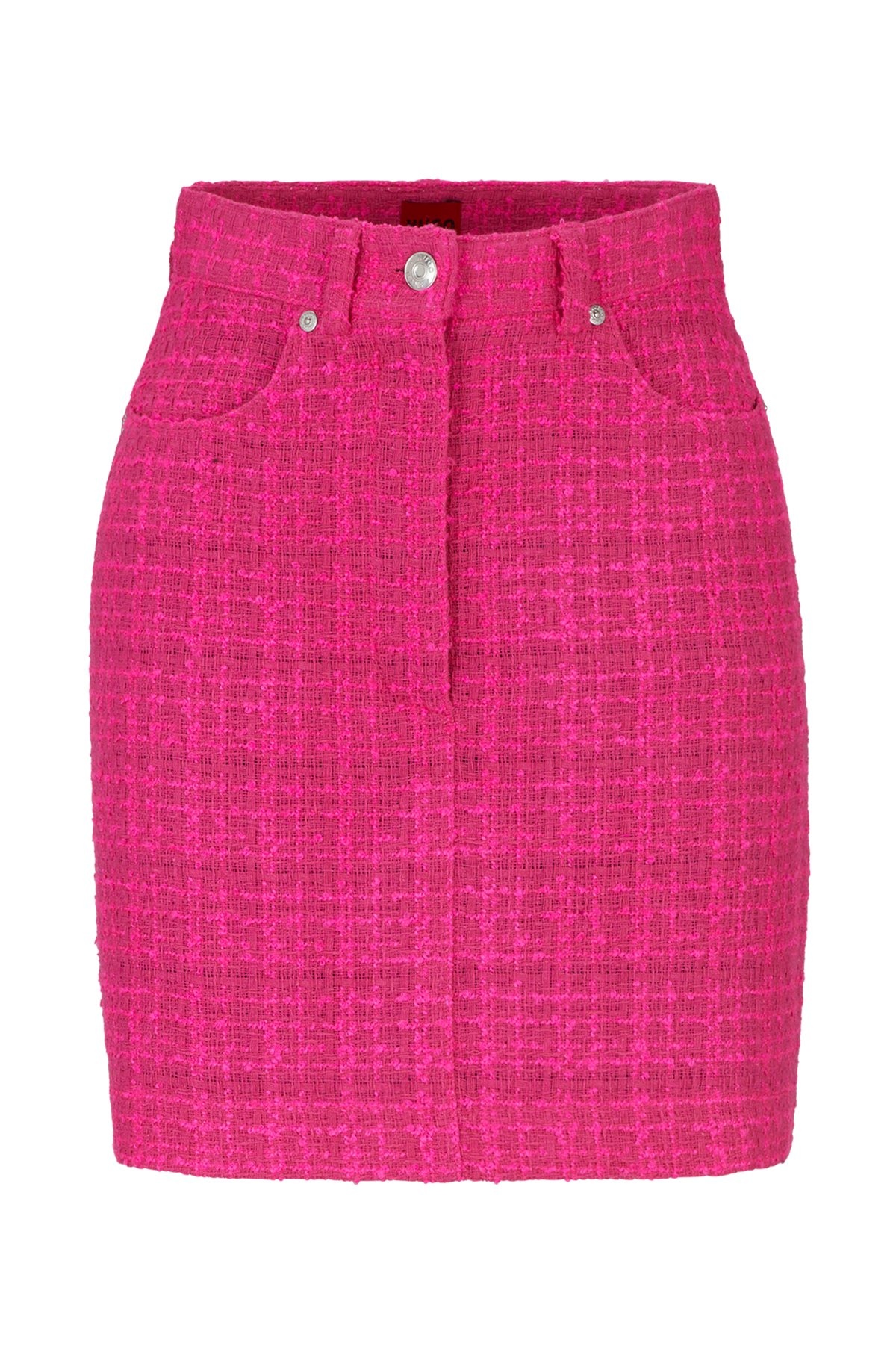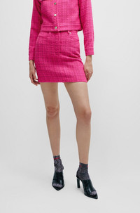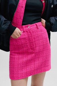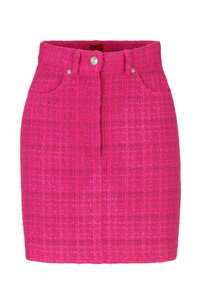 SIZE AND FIT The model wears a size 2 and is 5'11" tall with a, 32" chest, 20" waist and 35" hips. DETAILS Rusilata-1 - 50508664 A modern twist on the mini skirt by HUGO Womenswear, cut to a regular fit in patterned boucle material with belt loops and hardware trims. Regular fit Mini skirt Button and zip closure Pockets bottom front: French pocket No vent Fully lined Short length Fit back length: 42 cm (17 inches) QUALITY & CARE INSTRUCTIONS Iron Low Heat Do Not Wash Quality: 68% Polyacrylic, 24% Polyester, 8% Other fibres, Lining: 64% Viscose, 36% Polyester Reduced Dry Clean Do Not Bleach Do Not Tumble Dry