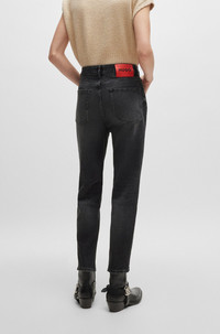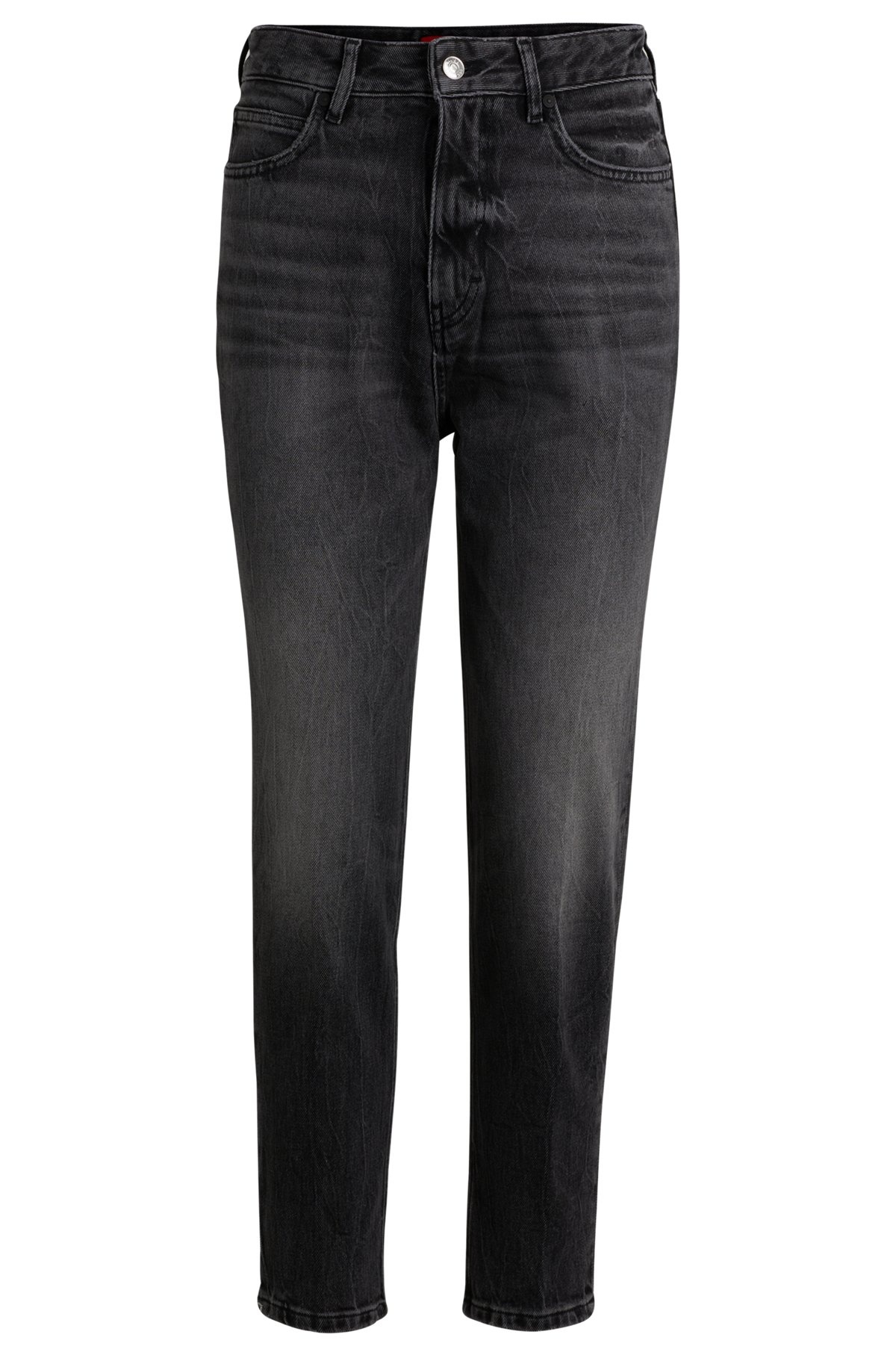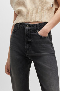 SIZE AND FIT The model wears a size 27/32 and is 5'10" tall with a, 31" chest, 23" waist and 35" hips. DETAILS 938 - 50519927 High-waisted mom-fit jeans, with a tapered leg, by HUGO Womenswear. This pair comes in comfort-stretch denim with a dark-gray tone. Tapered fit High rise Button and zip closure Pockets bottom front: Ticket pocket Tapered leg Pockets bottom back: Patch pocket Cropped QUALITY & CARE INSTRUCTIONS Machine Wash Cold Gentle Quality: 99% Cotton, 1% Elastane, pocketing: 65% Polyester, 35% Cotton Iron Medium Heat Do Not Bleach Do Not Tumble Dry Do Not Dry Clean