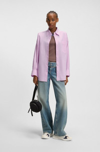 DETAILS Emista_B - 50542970 Garment dyed for a washed effect, this HUGO Womenswear blouse is so easy to style. Oversize fit. Happy HUGO logo embroidery. Made in lightweight cotton. Oversized fit Point collar Long sleeves Button cuffs QUALITY & CARE INSTRUCTIONS Iron Low Heat Machine Wash Cold Do Not Bleach Do Not Dry Clean Do Not Tumble Dry Quality: 100% Cotton