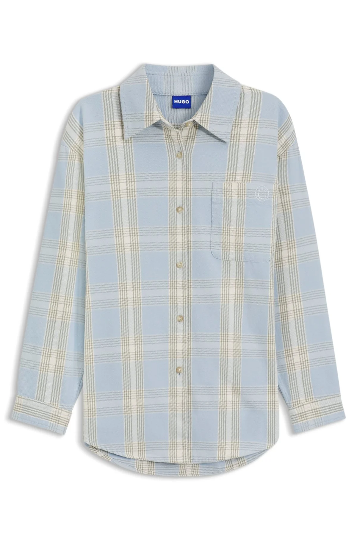 SIZE AND FIT The model wears a size 4 and is 5'10" tall with a, 33" chest, 23" waist and 35" hips. DETAILS Ecristy_B - 50542973 Lift everyday looks with the pastel check of this HUGO Womenswear blouse. Loose fit in soft cotton twill. Embroidered Happy HUGO logo on patch pocket. Oversized fit Point collar Long sleeves Button cuffs Patch chest pockets QUALITY & CARE INSTRUCTIONS Do Not Tumble Dry Quality: 100% Cotton Iron Low Heat Do Not Bleach Machine Wash Cold Do Not Dry Clean
