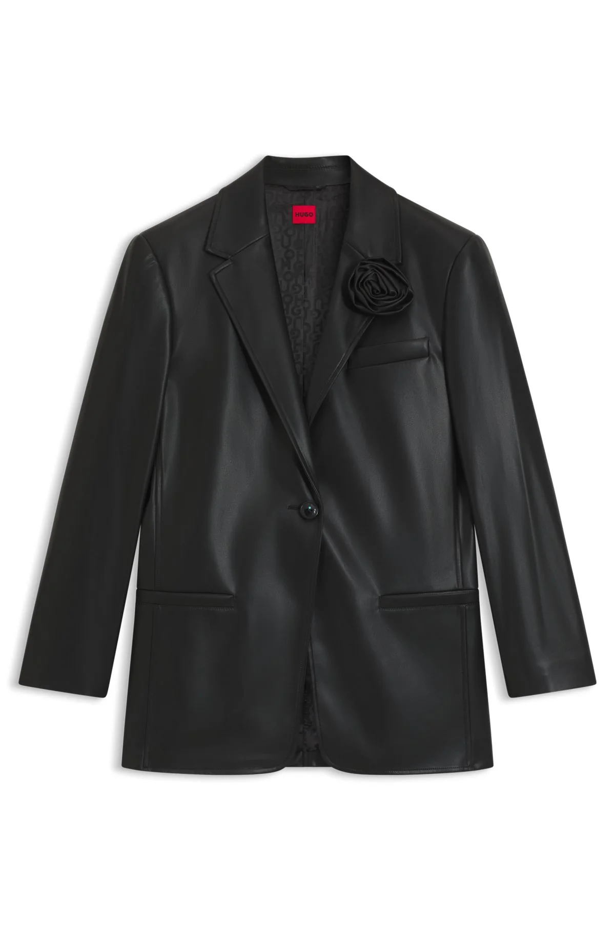 DETAILS Agure-1 - 50542314 With a natural shoulder and detachable rose at the lapel, this HUGO Womenswear blazer is a statement formal option. Made in soft synthetic coated fabric. Synthetic coated fabric, sometimes referred to as faux leather, is a fabric designed to resemble real leather, and/or display a matte, glossy, smooth, or textured, coated appearance. Regular fit Notched lapels Fastening top: Button closure Number of buttons: 1 Welt chest pockets Pockets top: Single welt pocket No cuffs No vent Fully lined Fit back length: 74 cm (29 inches) QUALITY & CARE INSTRUCTIONS Do Not Iron Do Not Tumble Dry Quality: 100% Polyester, Lining: 100% Polyester, Sleeve lining: 100% Polyester, Top: 100% Polyester Do Not Wash Reduced Dry Clean Do Not Bleach