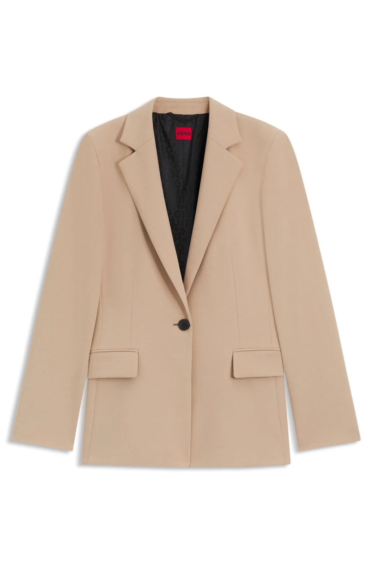 DETAILS Atana-2 - 50546778 Tailored to a straight fit with a single-button closure, this HUGO Womenswear blazer is a simple separate for your collection. Stretch material. Regular fit Notched lapels Fastening top: Button closure Number of buttons: 1 Pockets top: Flap pockets No cuffs Back vent Fully lined Fit back length: 68 cm (27 inches) QUALITY & CARE INSTRUCTIONS Reduced Dry Clean Iron Low Heat Do Not Bleach Do Not Tumble Dry Do Not Wash Quality: 64% Polyester, 31% Viscose, 5% Elastane, Lining: 55% Polyester, 45% Viscose, Sleeve lining: 95% Polyester, 5% Elastane