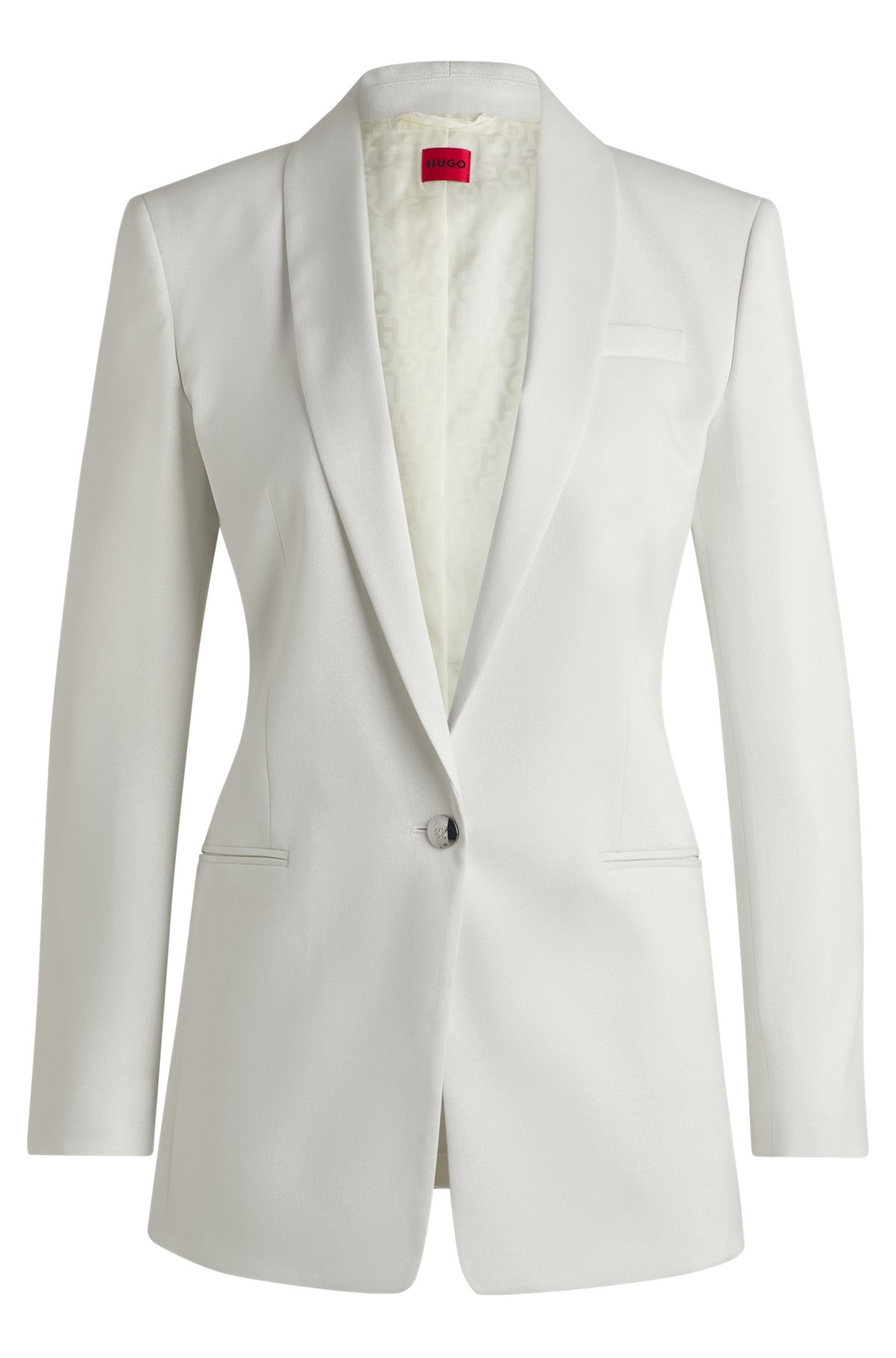 SIZE AND FIT The model wears a size 4 and is 5'8" tall with a, 31" chest, 24" waist and 35" hips. DETAILS Alinue - 50537759 Perfect for evening events, this HUGO Womenswear blazer has an elegant shimmer effect. Cleanly styled shawl lapels, plus flattering shaping darts. Stacked-logo button closure. Regular fit Shawl collar Fastening top: Button closure Number of buttons: 1 Welt chest pockets Pockets top: Welt pockets No cuffs Back vent Fully lined Fit back length: 73 cm (29 inches) QUALITY & CARE INSTRUCTIONS Quality: 62% Polyester, 28% Viscose, 5% Metallizing, 3% Polyamid, 2% Elastane, Lining: 55% Polyester, 45% Viscose, Sleeve lining: 64% Viscose, 36% Polyester Do Not Tumble Dry Do Not Bleach Do Not Wash Iron Low Heat Reduced Dry Clean