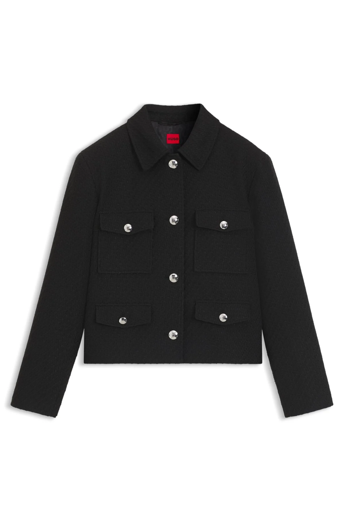 SIZE AND FIT The model wears a size 4 and is 5'10" tall with a, 32" chest, 24" waist and 35" hips. DETAILS Alayna - 50542615 In a regular fit with slightly dropped shoulders, this HUGO Womenswear blazer is inspired by French classics. Soft boucle with cotton. Polished buttons. Regular fit Fastening top: Button closure Number of buttons: 4 or more buttons Patch chest pockets Pockets top: Patch pockets No cuffs No vent Fully lined Fit back length: 54 cm (21 inches) QUALITY & CARE INSTRUCTIONS Do Not Wash Do Not Bleach Reduced Dry Clean Do Not Tumble Dry Iron Low Heat Quality: 46% Cotton, 25% Polyacrylic, 21% Polyester, 8% Viscose, Lining: 55% Polyester, 45% Viscose, Sleeve lining: 95% Polyester, 5% Elastane