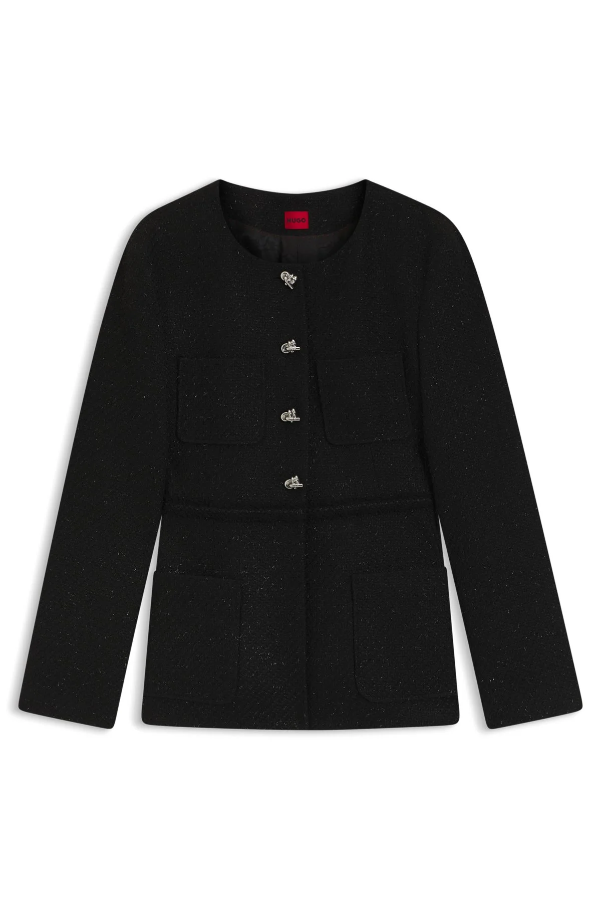 SIZE AND FIT The model wears a size 4 and is 5'10" tall with a, 31" chest, 23" waist and 35" hips. DETAILS Slightly fitted with a peplum shape, this HUGO Womenswear blazer is a fresh option. Distinctive knot buttons. Sparkling boucle with cotton. Jewelry-inspired chain tape. Regular fit Fastening top: Button closure Number of buttons: 4 or more buttons Patch chest pockets Pockets top: Patch pockets No cuffs No vent Fully lined Fit back length: 65 cm (26 inches) Afranzi - 50555880 QUALITY & CARE INSTRUCTIONS Iron Low Heat Do Not Bleach Do Not Wash Do Not Tumble Dry Material: 31% Polyester, 37% Cotton, 3% Metallizing, 26% Polyacrylic, 3% Other fibres, Lining: 55% Polyester, 45% Viscose, Sleeve lining: 95% Polyester, 5% Elastane Reduced Dry Clean