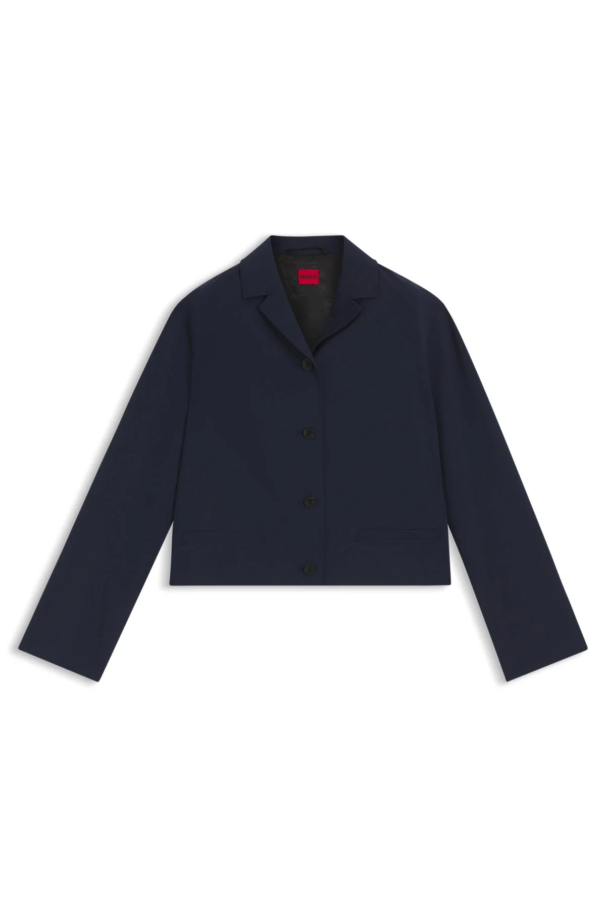 SIZE AND FIT The model wears a size 4 and is 5'10" tall with a, 29" chest, 24" waist and 35" hips. DETAILS Inject menswear-inspired style into any look with the cropped, straight fit of this HUGO Womenswear blazer. Short lapels. Melange fabric with added stretch. Relaxed fit Notched lapels Fastening top: Button closure Number of buttons: 4 or more buttons Pockets top: Welt pockets No cuffs No vent Fully lined Cropped Fit back length: 50 cm (20 inches) Ambrasa - 50554031 QUALITY & CARE INSTRUCTIONS Do Not Bleach Reduced Dry Clean Do Not Tumble Dry Cold, gentle machine wash; reduced spin speed. Iron Low Heat Material: 63% Polyester, 31% Viscose, 6% Elastane, Lining: 55% Polyester, 45% Viscose, Sleeve lining: 95% Polyester, 5% Elastane