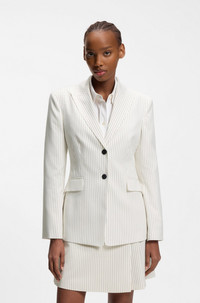 DETAILS Crafted in stretch material for comfort, this HUGO Womenswear blazer is patterned with a classic pinstripe. Regular fit with definition at the waist. Regular fit Peaked lapels Fastening top: Button closure Number of buttons: 2 Pockets top: Flap pockets No cuffs No vent Fully lined Fit back length: 68 cm (27 inches) Asmalla - 50561472 QUALITY & CARE INSTRUCTIONS Material: 77% Polyester, 20% Viscose, 3% Elastane, Lining: 55% Polyester, 45% Viscose, Sleeve lining: 100% Polyester Do Not Bleach Do Not Tumble Dry Do Not Wash Iron Low Heat Reduced Dry Clean