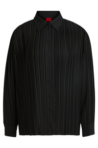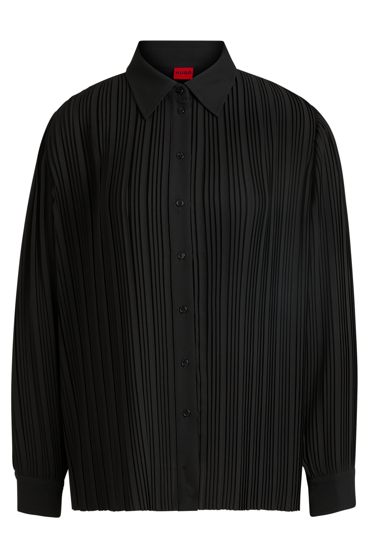 SIZE AND FIT The model wears a size 4 and is 5'9" tall with a, 31" chest, 23" waist and 35" hips. DETAILS Ebreca - 50524203 A feminine blouse by HUGO, designed with plisse pleats and solid trims. This elegant piece is tailored to a straight fit in soft crepe fabric. Regular fit Point collar Long sleeves Button cuffs QUALITY & CARE INSTRUCTIONS Quality: 100% Polyester, Collar: 100% Polyester Do Not Bleach Do Not Tumble Dry Machine Wash Cold Dry Clean Only Do Not Iron