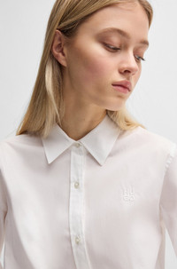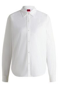 SIZE AND FIT The model wears a size 4 and is 5'8" tall with a, 29" chest, 22" waist and 34" hips. DETAILS The Essential Shirt - 50496339 A chic wardrobe essential, this HUGO Womenswear blouse comes in lightweight stretch-cotton canvas for comfort. Versatile regular fit. Subtle stacked logo. Regular fit Point collar Long sleeves Button cuffs Fit back length: 66 cm (26 inches) QUALITY & CARE INSTRUCTIONS Do Not Bleach Do Not Tumble Dry Machine Wash Cold Do Not Dry Clean Iron Low Heat Quality: 97% Cotton, 3% Elastane