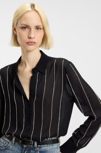 SIZE AND FIT The model wears a size 4 and is 5'10" tall with a, 32" chest, 24" waist and 35" hips. DETAILS Add impact to evening looks with the rhinestone pinstripes of this HUGO Womenswear blouse. Cut to a regular fit in soft crepe. Regular fit Point collar Long sleeves Button cuffs Eldja - 50548400 QUALITY & CARE INSTRUCTIONS Do Not Bleach Do Not Wash Material: 100% Viscose Do Not Tumble Dry Dry Clean Only Do Not Iron