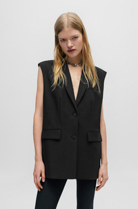 SIZE AND FIT The model wears a size 2 and is 5'10" tall with a, 31" chest, 24" waist and 34" hips. DETAILS Aneris - 50475802 A long-length waistcoat in a regular fit by HUGO Womenswear. Featuring a single-breasted closure and wide shoulders, this modern waistcoat is crafted in stretch fabric with flap pockets and notch lapels. A full lining detailed with HUGO logos completes this piece. Regular fit Notched lapels Fastening top: Button closure Number of buttons: 2 Welt chest pockets Pockets top: Flap pockets No cuffs Back vent Fully lined Fit back length: 76 cm (30 inches) QUALITY & CARE INSTRUCTIONS Do Not Wash Quality: 64% Polyester, 31% Viscose, 5% Elastane, Lining: 66% Viscose, 34% Polyester Do Not Bleach Do Not Tumble Dry Iron Low Heat Reduced Dry Clean