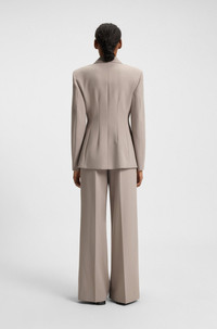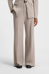 SIZE AND FIT The model wears a size 4 and is 5'8" tall with a, 31" chest, 23" waist and 34" hips. DETAILS Hasmina - 50545533 With a straight fit that widens through the leg, these HUGO Womenswear trousers are a modern formal foundation. Comfortable stretch fabric. Regular fit High rise Hook and zip closure Wide leg Crease Pockets bottom front: Side pockets Pockets bottom back: Welt pocket Fit foot width: 64,0 cm (25.2 inches) QUALITY & CARE INSTRUCTIONS Do Not Tumble Dry Machine Wash Cold Gentle Reduced Dry Clean Iron Low Heat Do Not Bleach Quality: 64% Polyester, 31% Viscose, 5% Elastane