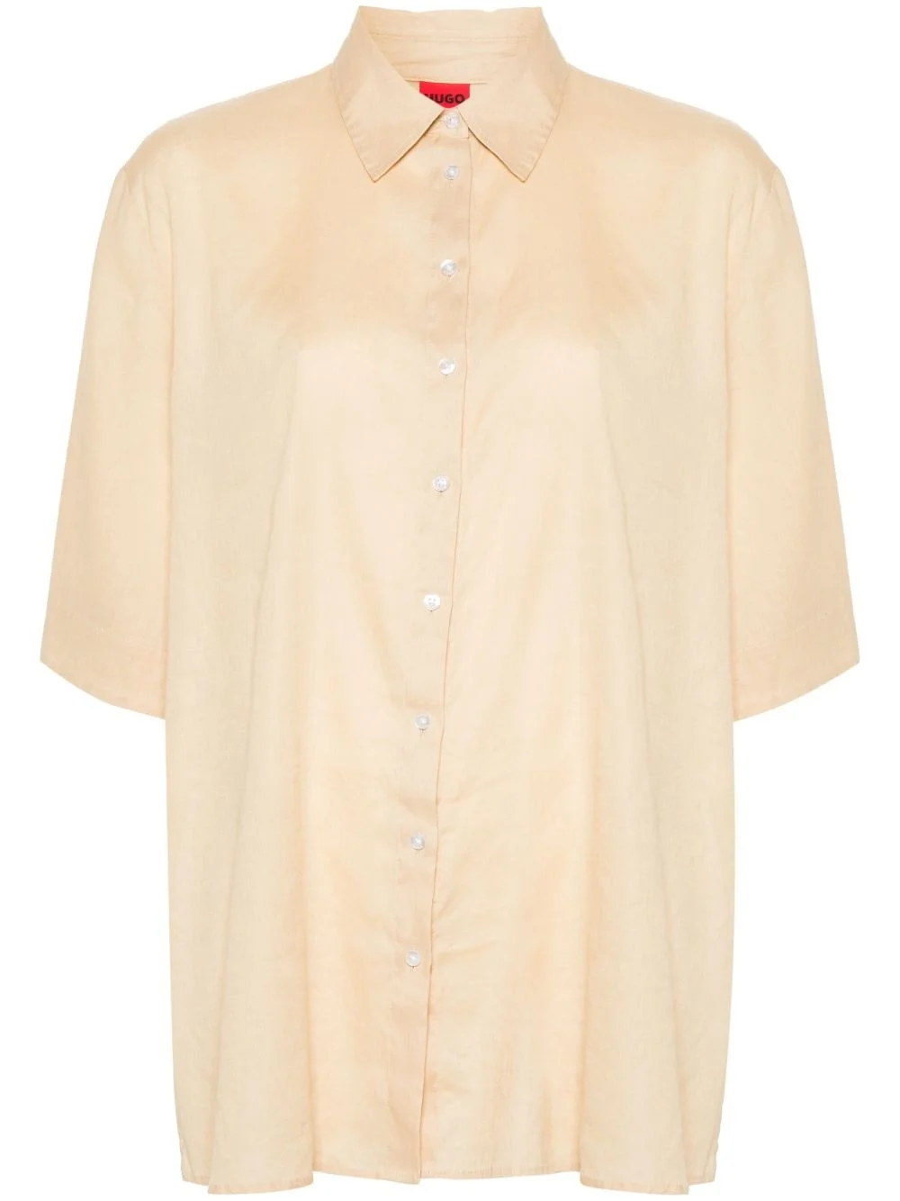 regular-fit shirt Highlights - Beige - Linen-lyocell blend - Slub texture - Button-down collar - Short sleeves - Mini logo tag - Short side slits - Straight hem - Front button fastening Imported Composition Linen/Flax 61%, Lyocell 37%, Elastane 2% SIZE & FIT Model measurements Height 5 ft 9 in(1.74 m) Bust/Chest 34.64 in(88 cm) Hips 36.61 in(93 cm) Waist 26.37 in(67 cm) FittingInformation Designed for a boxy fit, intended for a loose fit throughout Made from a lightweight stretch fabric, this piece offers elasticity and flexibility when worn This piece fits true to size – take your usual size