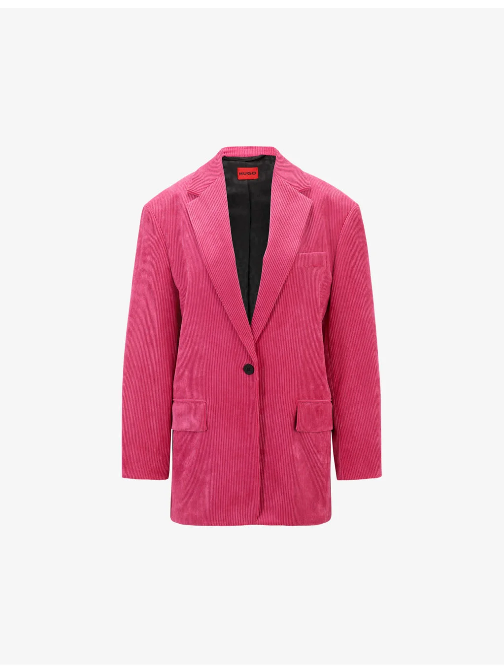 PRODUCT DETAILS - HUGO stretch-cord jacket - 90% polyester, 8% polyamide, 2% elastane - Exposed button fastening at front - Regular fit, peak lapels, welt pocket at chest, long sleeves, two pockets at the side, all-over cord design, logo patch at the back - Dry clean - True to size - Model is 5ft 9in/1.75m and wears a size UK 8 - Midweight, slight stretch Ref: R04252958