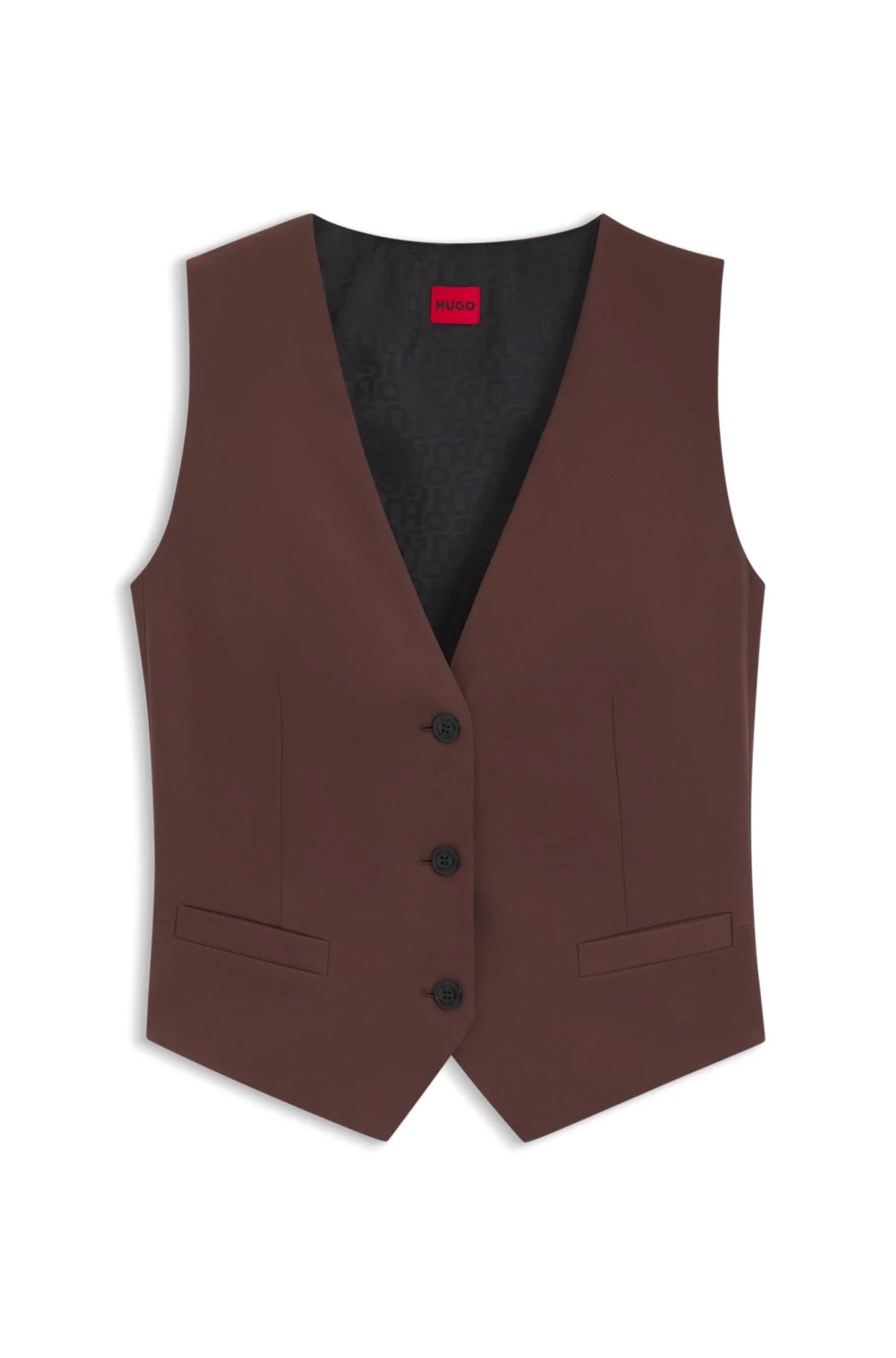 DETAILS Aumara-2 - 50545278 Creating a modern ensemble with the matching trousers, this HUGO Womenswear waistcoat is a menswear-inspired essential. Straight fit. Stretch fabric. Buckle detail. Regular fit Fastening top: Button closure Number of buttons: 3 Pockets top: Welt pockets No cuffs No vent Fully lined Cropped Fit back length: 46 cm (18 inches) QUALITY & CARE INSTRUCTIONS Do Not Wash Do Not Bleach Quality: 72% Polyester, 25% Viscose, 3% Elastane, Lining: 55% Polyester, 45% Viscose Reduced Dry Clean Do Not Tumble Dry Iron Low Heat