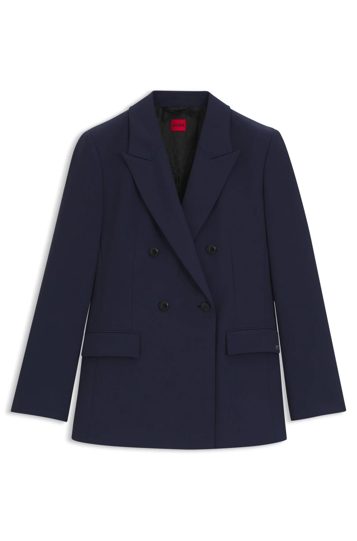 SIZE AND FIT The model wears a size 4 and is 0'0" tall with a, 30" chest, 23" waist and 33" hips. DETAILS Amilea - 50544730 With its wide lapels and double-breasted closure, this relaxed HUGO Womenswear blazer achieves a modern silhouette. Comfortable stretch. Relaxed fit Peaked lapels Fastening top: Button closure Number of buttons: Double-breasted Pockets top: Flap pockets No cuffs Back vent Fully lined Fit back length: 70 cm (28 inches) QUALITY & CARE INSTRUCTIONS Do Not Tumble Dry Quality: 64% Polyester, 31% Viscose, 5% Elastane, Lining: 50% Viscose, 50% Polyester, Sleeve lining: 64% Viscose, 36% Polyester Reduced Dry Clean Iron Low Heat Do Not Wash Do Not Bleach