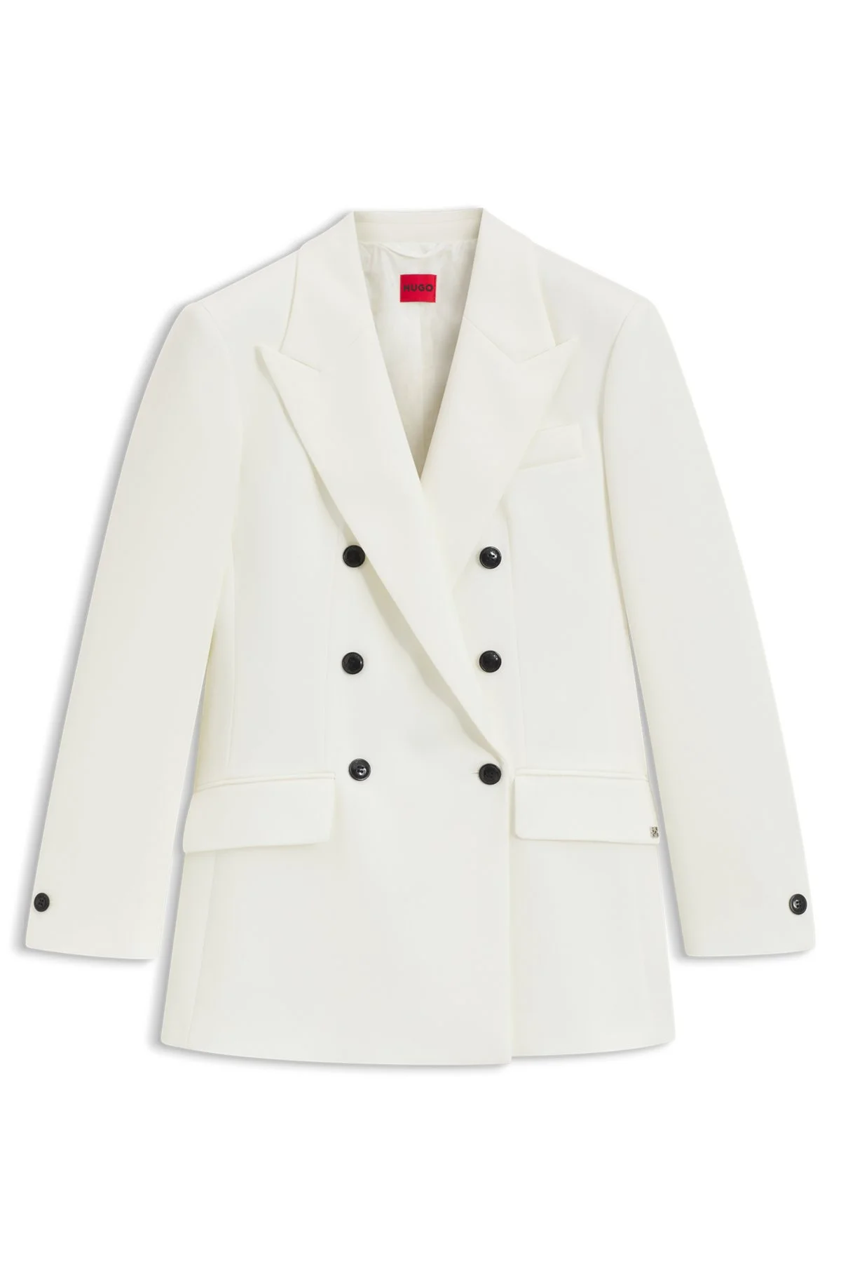 DETAILS Amalisa - 50544744 This modern HUGO Womenswear blazer embraces an oversize silhouette that will go with anything. Stretch twill with a fluid feel. Double-breasted closure. Subtle branding. Relaxed fit Peaked lapels Fastening top: Button closure Number of buttons: Double-breasted Welt chest pockets Pockets top: Flap pockets Functional button Back vent Fully lined Fit back length: 74 cm (29 inches) QUALITY & CARE INSTRUCTIONS Do Not Tumble Dry Do Not Bleach Reduced Dry Clean Do Not Wash Quality: 75% Polyester, 22% Viscose, 3% Elastane, Lining: 50% Viscose, 50% Polyester, Sleeve lining: 64% Viscose, 36% Polyester Iron Low Heat