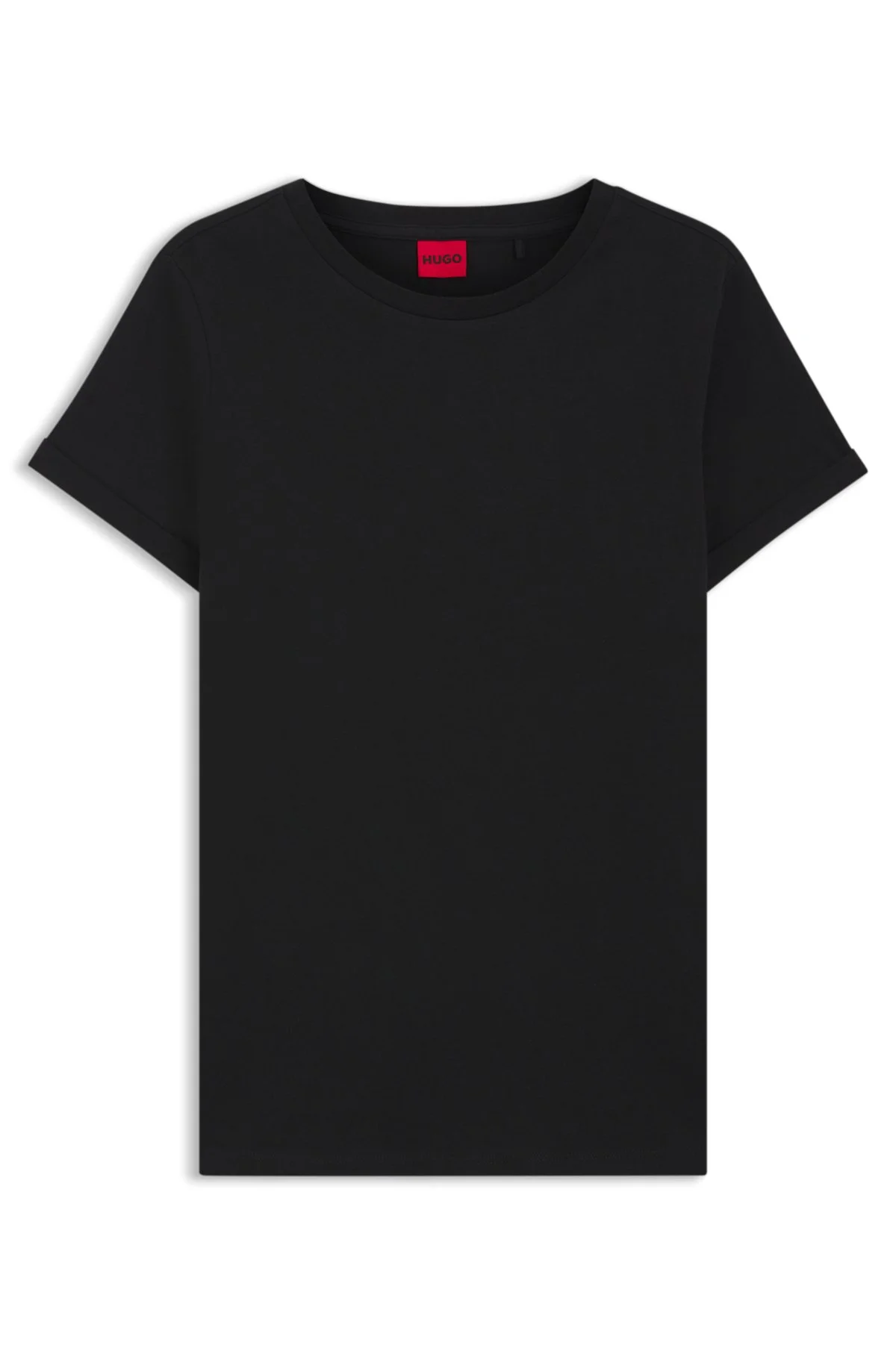 SIZE AND FIT The model wears a size S and is 5'9" tall with a, 29" chest, 23" waist and 34" hips. DETAILS The Plain Tee - 50417212 Featuring rolled sleeves for casual style, this HUGO Womenswear T-shirt is cut in soft cotton jersey. Slim fit Logo print at rear neck. Slim fit Neckline: Crew neck Short sleeves Standard length QUALITY & CARE INSTRUCTIONS Quality: 100% Cotton Do Not Bleach Do Not Dry Clean Machine Wash Cold Gentle Do Not Tumble Dry Iron Low Heat