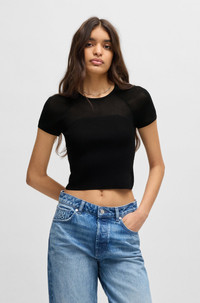 SIZE AND FIT The model wears a size S and is 5'10" tall with a, 30" chest, 23" waist and 35" hips. DETAILS Slevetta - 50538232 Combining a ribbed knit with sheer fabric, this cropped HUGO Womenswear top is effortlessly chic. Cut-out rear detail with logo chain trim. Flattering fit. Slim fit Neckline: Crew neck Short sleeves Fit back length: 46 cm (18 inches) QUALITY & CARE INSTRUCTIONS Hand Wash Only Quality: 67% Viscose (57% recycled), 33% Polyamid, Sleeve: 75% Viscose (6% recycled), 25% Polyamid, Back panel: 65% materialcode.RVI, 35% Polyamid Do Not Tumble Dry Do Not Bleach Iron Low Heat Reduced Dry Clean