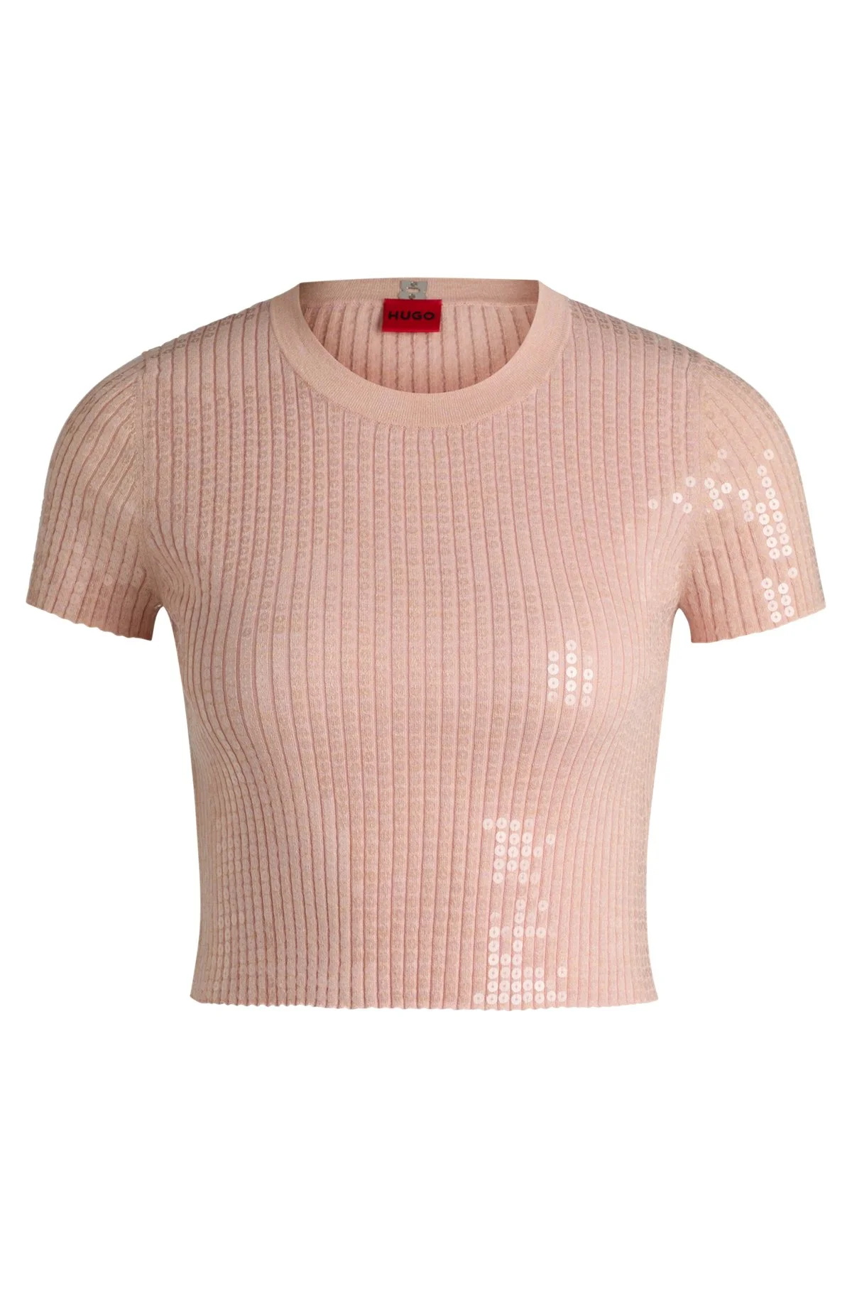 SIZE AND FIT The model wears a size S and is 5'8" tall with a, 31" chest, 23" waist and 34" hips. DETAILS Sequina - 50532160 A cropped sweater in a defined fit by HUGO Womenswear. Embellished with transparent sequins, this piece is knitted in stretch yarn. Slim fit Neckline: Crew neck Short sleeves QUALITY & CARE INSTRUCTIONS Iron Low Heat Hand Wash Only Quality: 58% Viscose, 22% Polyamid, 16% Polyester, 4% Elastane Do Not Bleach Do Not Tumble Dry Do Not Dry Clean