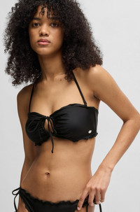 SIZE AND FIT The model wears a size S and is 5'8" tall with a, 29" chest, 24" waist and 35" hips. DETAILS RUFFLE BANDEAU - 50540235 With removable pads and a cut-out front with a tie, this HUGO Womenswear bikini top is an elegant choice. In plain and printed designs. Padding: Removable padding QUALITY & CARE INSTRUCTIONS Do Not Bleach Do Not Tumble Dry Hand Wash Only Do Not Iron Do Not Dry Clean Quality: 80% Polyamide, 20% Elastane, Lining: 92% Polyester, 8% Elastane