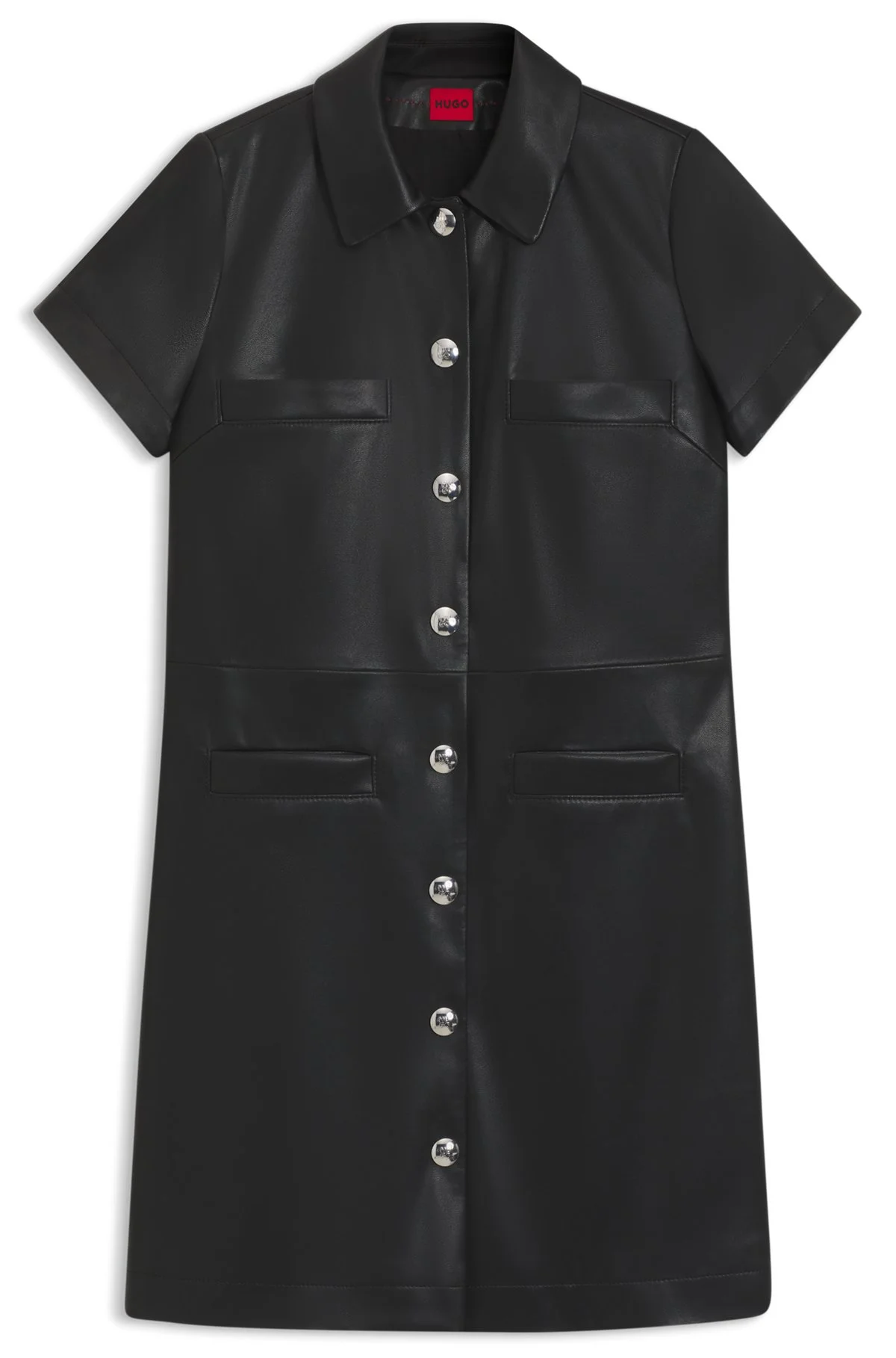 DETAILS Kalindana-1 - 50542354 This HUGO Womenswear shirt dress is a twist on a classic in synthetic coated fabric. Trimmed with statement press-stud buttons through the front. Synthetic coated fabric, sometimes referred to as faux leather, is a fabric designed to resemble real leather, and/or display a matte, glossy, smooth, or textured, coated appearance. Regular fit Neckline: Point collar Fastening top: Press-stud closure Short sleeves No cuffs Welt chest pockets Pockets top: Single welt pocket No vent Fully lined Fit back length: 86 cm (34 inches) QUALITY & CARE INSTRUCTIONS Do Not Tumble Dry Cold, gentle machine wash; reduced spin speed. Do Not Iron Reduced Dry Clean Quality: 100% Polyester, Lining: 100% Polyester Do Not Bleach