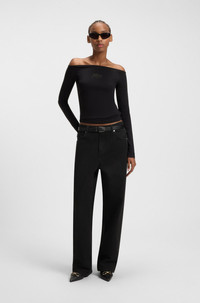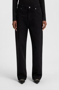 SIZE AND FIT The model wears a size 27/32 and is 5'9" tall with a, 29" chest, 23" waist and 34" hips. DETAILS Leni_B - 50548982 Create a variety of easy casual looks with these HUGO Womenswear jeans. Crafted in versatile black denim with a low rise and loose fit. loose fit Low rise Button and zip closure Pockets bottom front: Ticket pocket Wide leg Pockets bottom back: Patch pocket Standard length QUALITY & CARE INSTRUCTIONS Machine Wash Cold Gentle Quality: 100% Cotton (5% recycled), pocketing: 100% Cotton Do Not Tumble Dry Do Not Bleach Iron Medium Heat Do Not Dry Clean