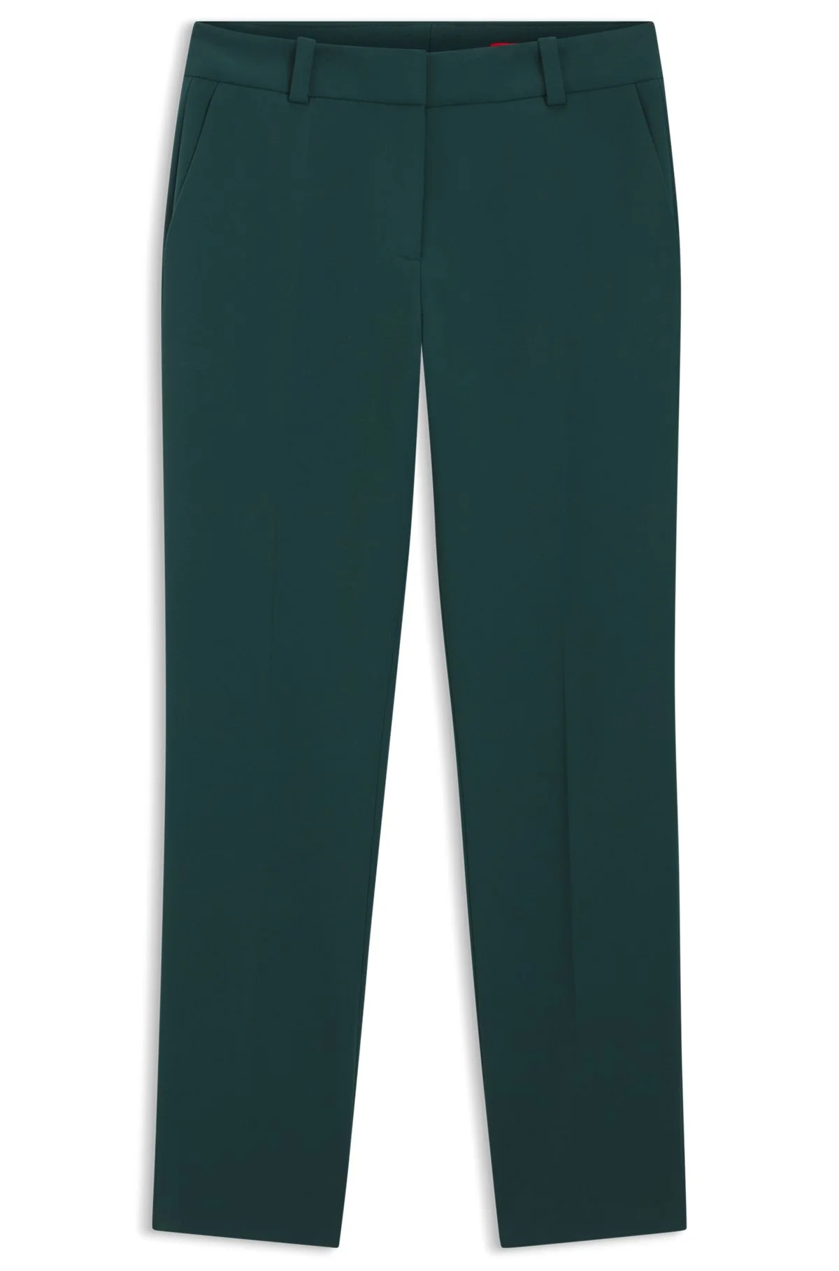 DETAILS Hetana - 50501948 Versatile formal trousers by HUGO Womenswear. Featuring a cropped length with slit hems, this regular-rise pair is tailored to a slim fit. Slim fit Regular rise Hook and zip closure Slim leg Crease Pockets bottom front: French pocket Pockets bottom back: Welt pocket Unlined Fit foot width: 32,0 cm (12.6 inches) QUALITY & CARE INSTRUCTIONS Do Not Tumble Dry Reduced Dry Clean Iron Low Heat Do Not Wash Do Not Bleach Quality: 64% Polyester, 31% Viscose, 5% Elastane