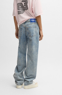 SIZE AND FIT The model wears a size 28/32 and is 5'8" tall with a, 29" chest, 24" waist and 35" hips. DETAILS Elyah_B - 50534771 The all-over logo print on these HUGO Womenswear jeans adds individuality to a casual look. Modern straight fit. Tinted rigid blue denim. Straight fit Mid rise Button and zip closure Pockets bottom front: Ticket pocket Straight leg Pockets bottom back: Patch pocket Extra long length QUALITY & CARE INSTRUCTIONS Do Not Dry Clean Quality: 100% Cotton, pocketing: 100% Cotton Do Not Tumble Dry Do Not Bleach Iron Medium Heat Machine Wash Cold Gentle