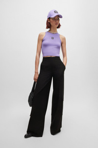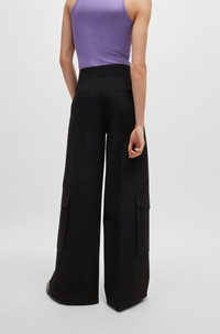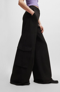 SIZE AND FIT The model wears a size 4 and is 5'10" tall with a, 31" chest, 23" waist and 35" hips. DETAILS Himana - 50518970 Contemporary long-length cargo trousers in a straight fit by HUGO Womenswear. This high-waisted pair is crafted in stretch material with a wide leg. Regular fit High rise Hook and zip closure Wide leg Crease Pockets bottom front: Patch pocket Pockets bottom back: Welt pocket Unlined Fit foot width: 77,0 cm (30.3 inches) QUALITY & CARE INSTRUCTIONS Iron Low Heat Quality: 79% Viscose, 18% Polyester, 3% Elastane, pocketing: 100% Cotton Do Not Wash Reduced Dry Clean Do Not Bleach Do Not Tumble Dry