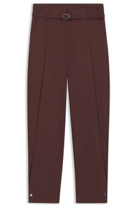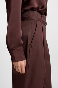 SIZE AND FIT The model wears a size 4 and is 5'10" tall with a, 32" chest, 24" waist and 35" hips. DETAILS Hazelda-1 - 50542572 Featuring a modern tapered fit with adjustable hems, these HUGO Womenswear trousers are a contemporary foundation. Cotton twill. Buckled belt at the high-rise waist. Tapered fit High rise Hook and zip closure Tapered leg Pleat front Pockets bottom front: French pocket Pockets bottom back: Welt pocket Unlined QUALITY & CARE INSTRUCTIONS Do Not Tumble Dry Machine Wash Cold Gentle Quality: 100% Cotton Reduced Dry Clean Iron Low Heat Do Not Bleach