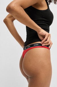 SIZE AND FIT The model wears a size S and is 5'8" tall with a, 29" chest, 24" waist and 35" hips. DETAILS TRIPLE THONG LACE - 50535265 With a comfortable regular rise, these HUGO Womenswear thongs feature repeat logos around the waistband. Made in breathable stretch lace for modern elegance. QUALITY & CARE INSTRUCTIONS Do Not Bleach Do Not Tumble Dry Machine Wash Cold Do Not Iron Do Not Dry Clean Quality: 87% Polyamid, 13% Elastane, Lining: 100% Cotton, Waistband: 66% Polyamid, 25% Polyester, 9% Elastane