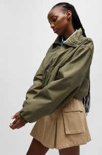 SIZE AND FIT The model wears a size 4 and is 5'8" tall with a, 31" chest, 23" waist and 34" hips. DETAILS Ankara-1-D_B - 50531180 A voluminous HUGO Womenswear jacket with cords at the waistband and collar for adjustable styling. Soft cotton poplin. Trimmed with happy HUGO logos. QUALITY & CARE INSTRUCTIONS Quality: 100% Cotton, Lining: 100% Cotton, pocketing: 100% Cotton Do Not Tumble Dry Do Not Bleach Do Not Wash Iron Low Heat Reduced Dry Clean