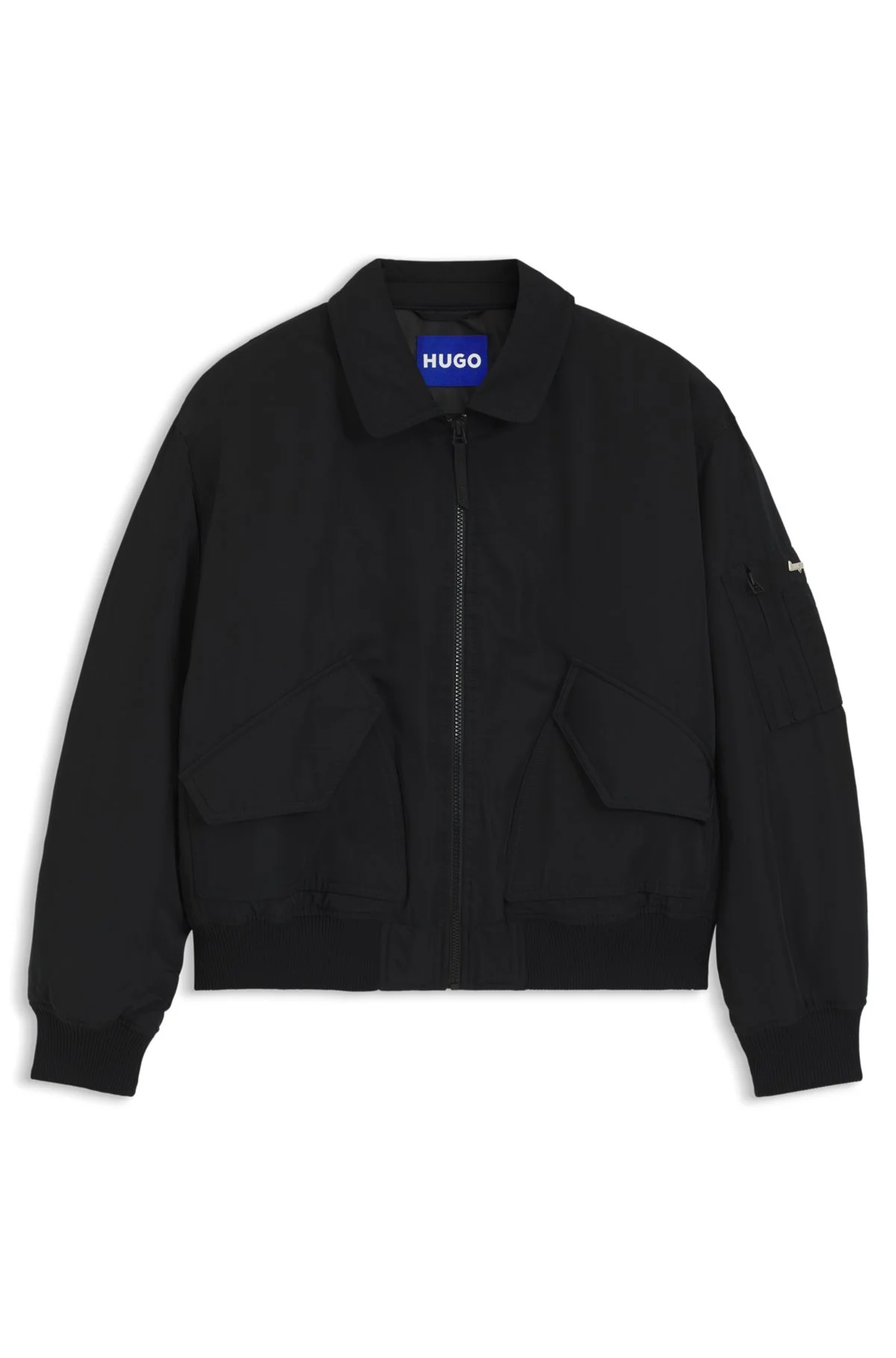 SIZE AND FIT Oversize fit The model wears a size S and is 5'8" tall with a, 31" chest, 23" waist and 34" hips. DETAILS This HUGO Womenswear jacket, featuring rounded aviator-style flap pockets, is lightly padded with a water-repellent finish. Oversize fit. Sleeve pocket with logo rivet. Oversized fit Fastening top: Zip closure Pockets top: Flap pockets Ribbed cuffs Fully lined Standard length Fami-1_B - 50556850 QUALITY & CARE INSTRUCTIONS Iron Low Heat Tumble Dry Low Heat Do Not Bleach Do Not Dry Clean Material: 100% Polyester, Lining: 100% Polyester, Wadding: 100% Polyester, Cuff / Waistband: 95% Polyamid, 5% Elastane Machine Wash Cold Gentle