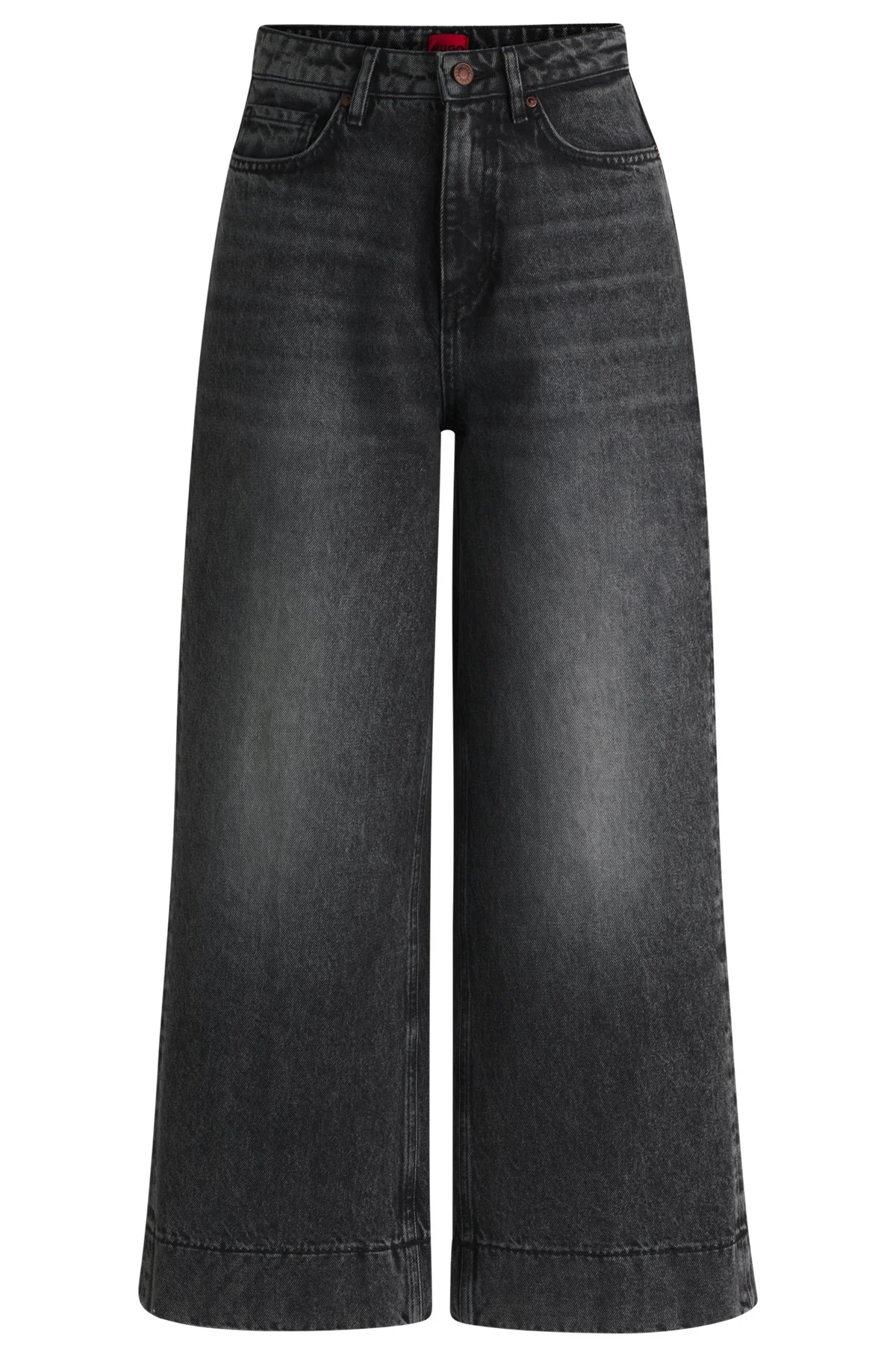 SIZE AND FIT The model wears a size 27/32 and is 5'9" tall with a, 31" chest, 23" waist and 35" hips. DETAILS Gevane - 50530309 Wide-leg jeans with a high-rise waist, by HUGO Womenswear. This slightly cropped pair is crafted in black rigid denim with used effects. modern fit High rise Button and zip closure Pockets bottom front: Ticket pocket Wide leg Pockets bottom back: Patch pocket Standard length QUALITY & CARE INSTRUCTIONS Iron Medium Heat Do Not Tumble Dry Do Not Bleach Quality: 100% Cotton, pocketing: 65% Polyester, 35% Cotton Machine Wash Cold Gentle Do Not Dry Clean