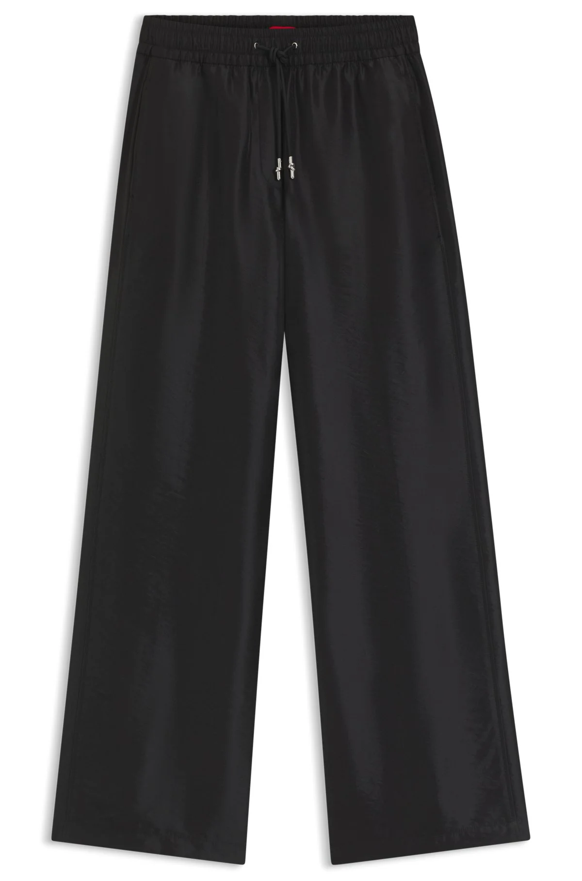 SIZE AND FIT The model wears a size 4 and is 5'8" tall with a, 31" chest, 23" waist and 34" hips. DETAILS With their relaxed, wide-leg fit, these high-waisted HUGO Womenswear trousers are the ultimate casual base. Soft twill. Hardware-tipped drawcord. Relaxed fit High rise Drawstring Wide leg Crease Pockets bottom front: Side slash pockets Unlined Hawila-1 - 50546825 QUALITY & CARE INSTRUCTIONS Do Not Wash Reduced Dry Clean Material: 48% Viscose, 30% Polyamid, 22% Polyester Do Not Bleach Iron Low Heat Do Not Tumble Dry