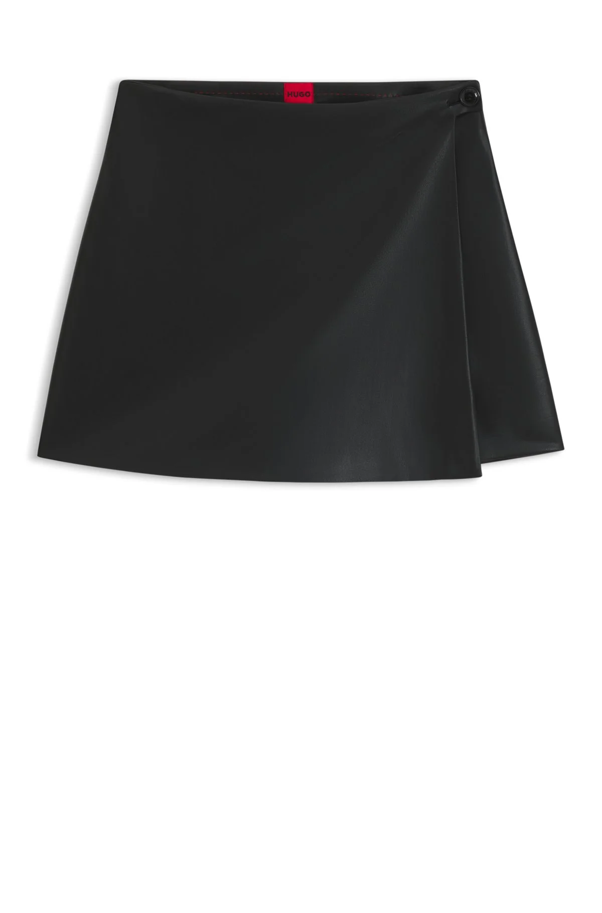 SIZE AND FIT The model wears a size 4 and is 5'10" tall with a, 32" chest, 24" waist and 35" hips. DETAILS Hotia-1 - 50542312 With a wrap front and button detail, this HUGO Womenswear mini skort is a modern take on a classic. Crafted in soft synthetic coated fabric. Synthetic coated fabric, sometimes referred to as faux leather, is a fabric designed to resemble real leather, and/or display a matte, glossy, smooth, or textured, coated appearance. Regular fit Regular rise Zip closure Pockets bottom back: Welt pocket Fully lined QUALITY & CARE INSTRUCTIONS Do Not Tumble Dry Do Not Iron Reduced Dry Clean Do Not Bleach Quality: 100% Polyester, Lining: 100% Polyester Cold, gentle machine wash; reduced spin speed.