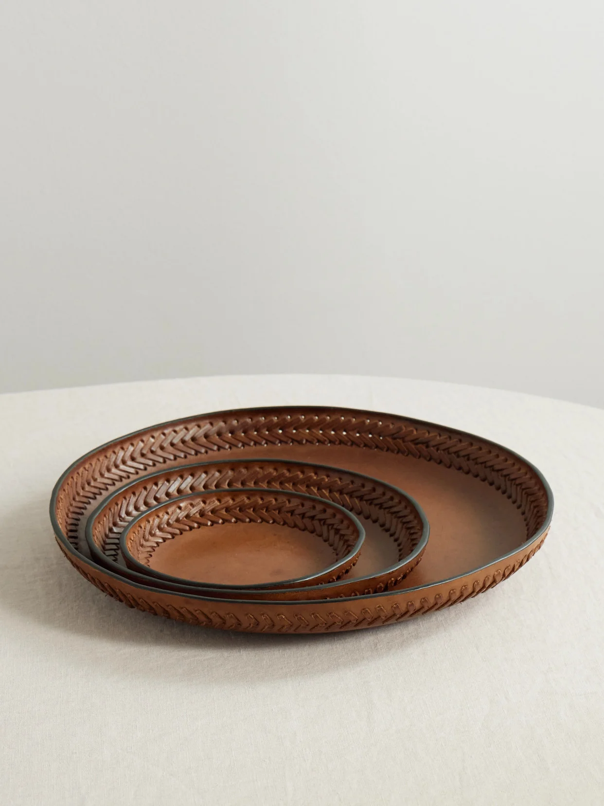 Hunting Season's home accessories are just as expertly crafted as its coveted bags. This stackable set of three trays is made from smooth leather using specialist molding techniques honored through generations. They have a buffed finish, inspired by Japanese lacquerware, and the edges have been artfully whipstitched in Colombia.