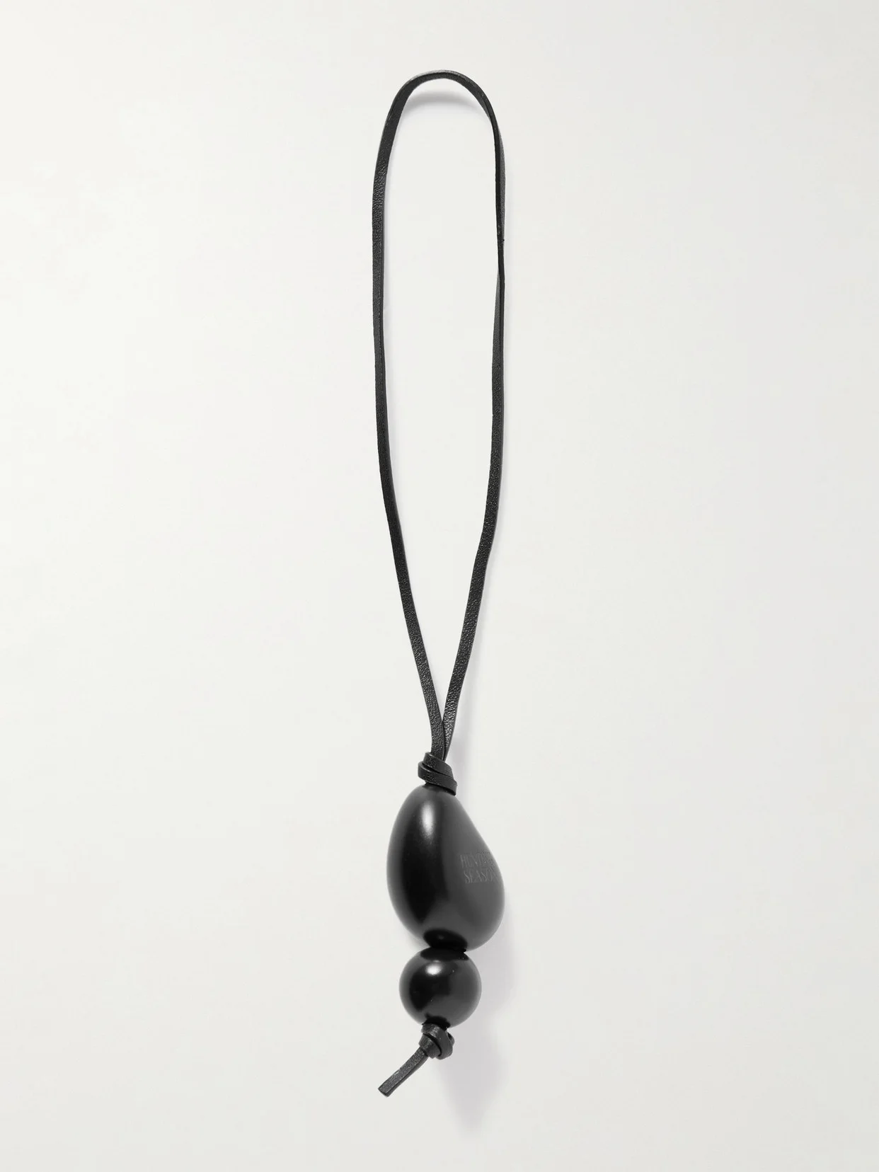 Hunting Season's bag charm is strung with black tagua seeds - each bead is carefully shaped by hand using traditional techniques. It hangs from a leather cord.