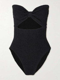 EDITORS'NOTES Hunza G's 'Alana' swimsuit takes cues from glamorous '50s styles. Made from supportive seersucker, it has a strapless, bandeau-style bodice with an alluring cutout and high-cut legs that elongate your frame. Style yours with a tonal pareo and cat-eye sunglasses. SIZE & FIT Model measurements: - Comfortably fits those who are between a size XSmall-XXLarge - High-cut style with medium brief coverage - Model is 175cm/ 5'9", bra size 32B and normally wears a size XSmall - Bust: 75cm/ 29.5" - Waist: 63cm/ 25" - Hip: 91cm/ 36" DETAILS & CARE - Black seersucker - Slips on - 97% nylon, 3% elastane - Machine wash at 30° with similar colors - Lotion, sunscreen, oil and chlorine can cause discoloration of this item; this is not a manufacturing defect. Please follow care instructions to keep your swimwear in the best condition