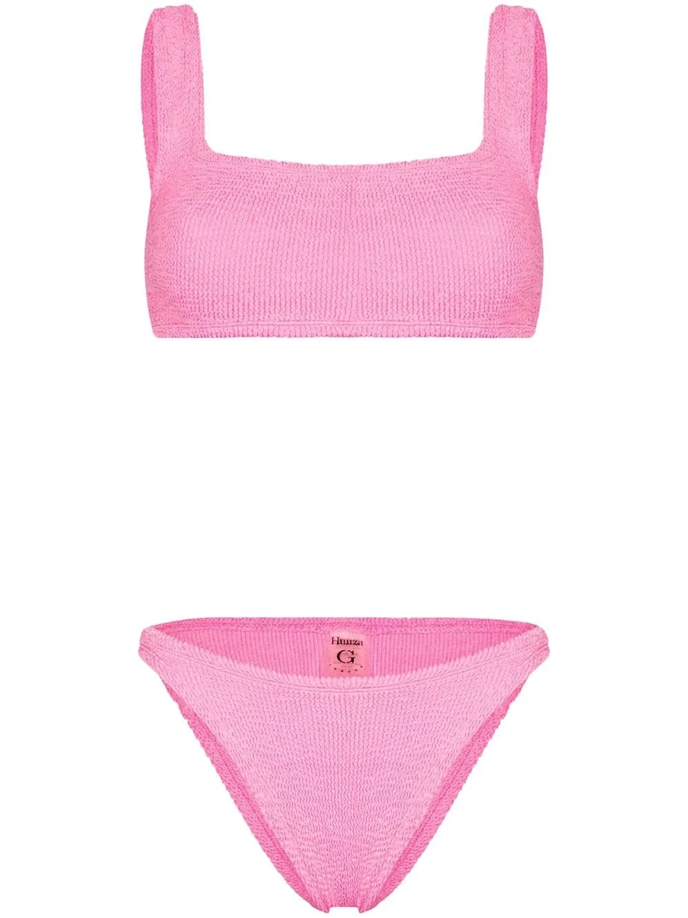 crinkled cropped bikini set Can't wait to splash out on holiday? Enjoy embracing sun-drenched mornings in this crinkled cropped bikini set from Hunza G that instantly brightens up your day with a bubblegum pink colour. Highlights - Pink - Scoop neck - Stretch-fit - Be mindful to try on swimwear over your own garments Made in United Kingdom Composition Nylon 88%, Lycra 12% SIZE & FIT Model measurements Height 5 ft 10 in(1.79 m) Bust/Chest 31.88 in(81 cm) Hips 35.43 in(90 cm) Waist 23.62 in(60 cm) FittingInformation This is a one size item Made with a mid-weight stretch fabric
