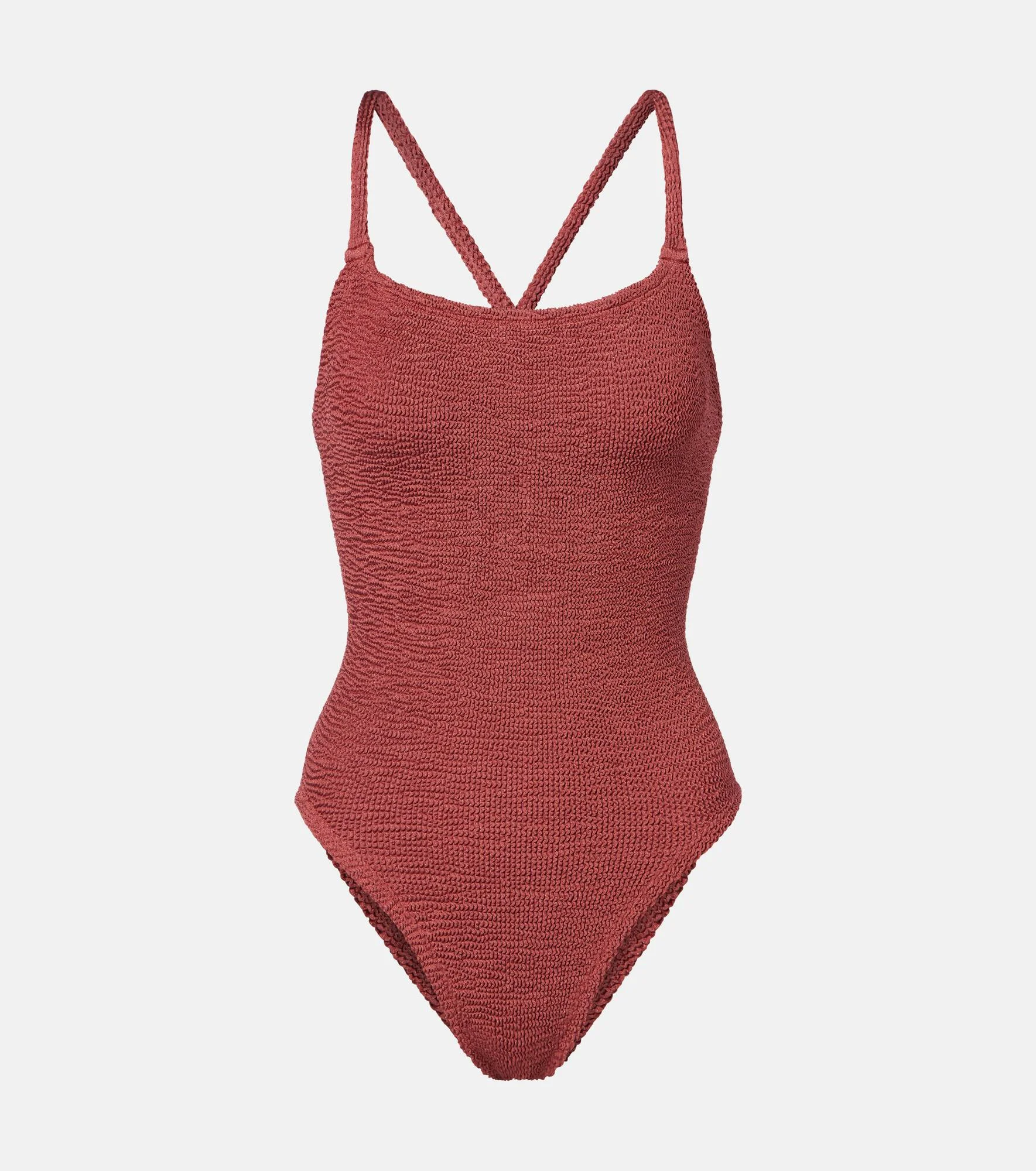The Bette swimsuit is made using Hunza G's Seamless Crinkle Technology, making it one-size-fits-all. The piece is complete with a low-back silhouette with crisscrossed straps. Product Details - Material: 97% polyamide, 3% elastane - Care instructions: machine wash at 30 degrees - Made in Morocco - Designer color name: Metallic Rosewood - Item color: burgundy - Item number: P01134387 Size & Fit - True to size - One size: perfect fit for sizes XS-M - Unpadded Top - High-cut leg