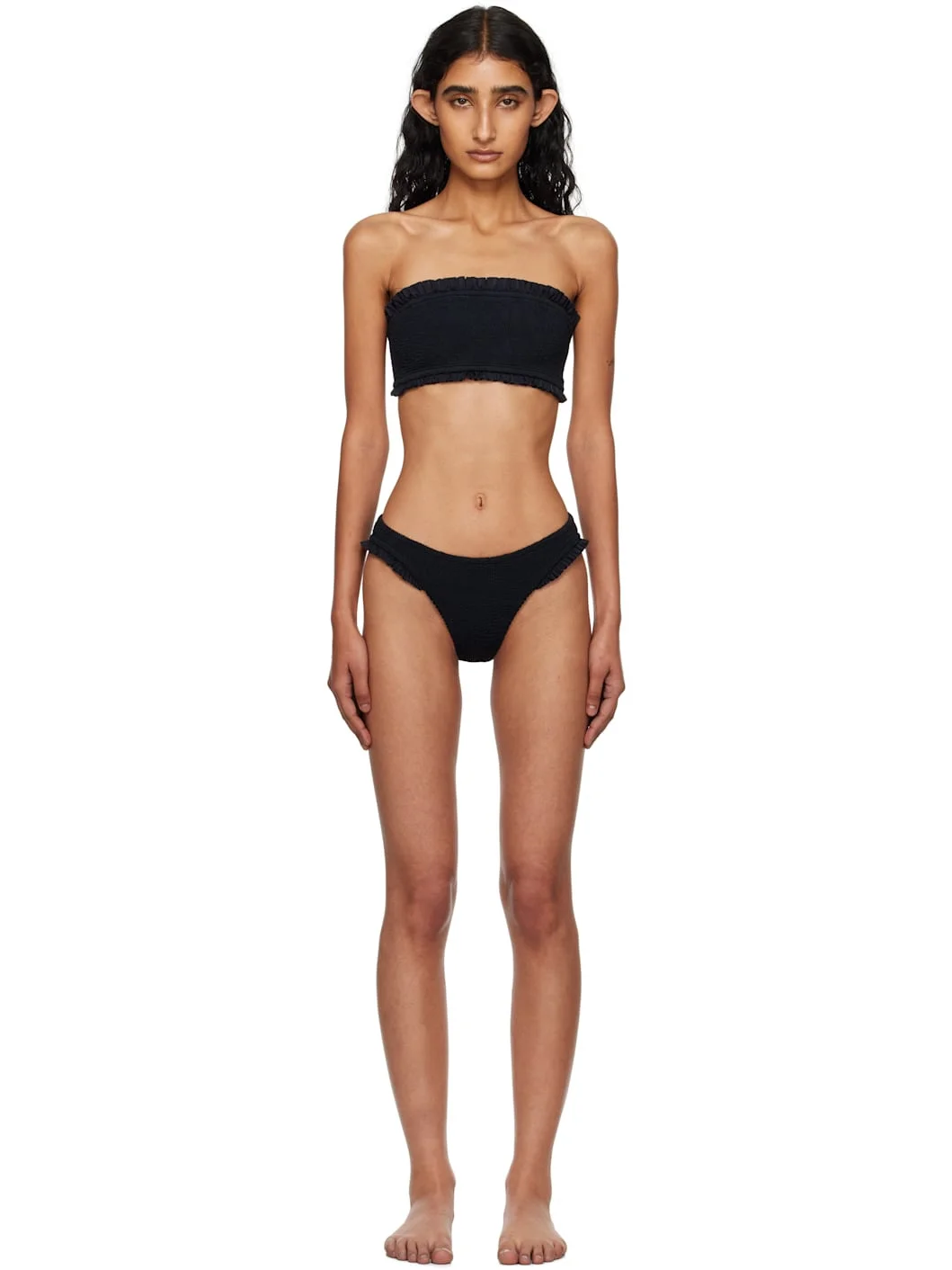 Shirred stretch nylon jersey bikini top and bottom. · Ruffles at straight neck, hem, and cuffs · Unlined This product uses Original Crinkle™ Technology. Fits US size 2-12. Supplier color: Black 97% polyamide, 3% elastane. Made in United Kingdom 252431F105006