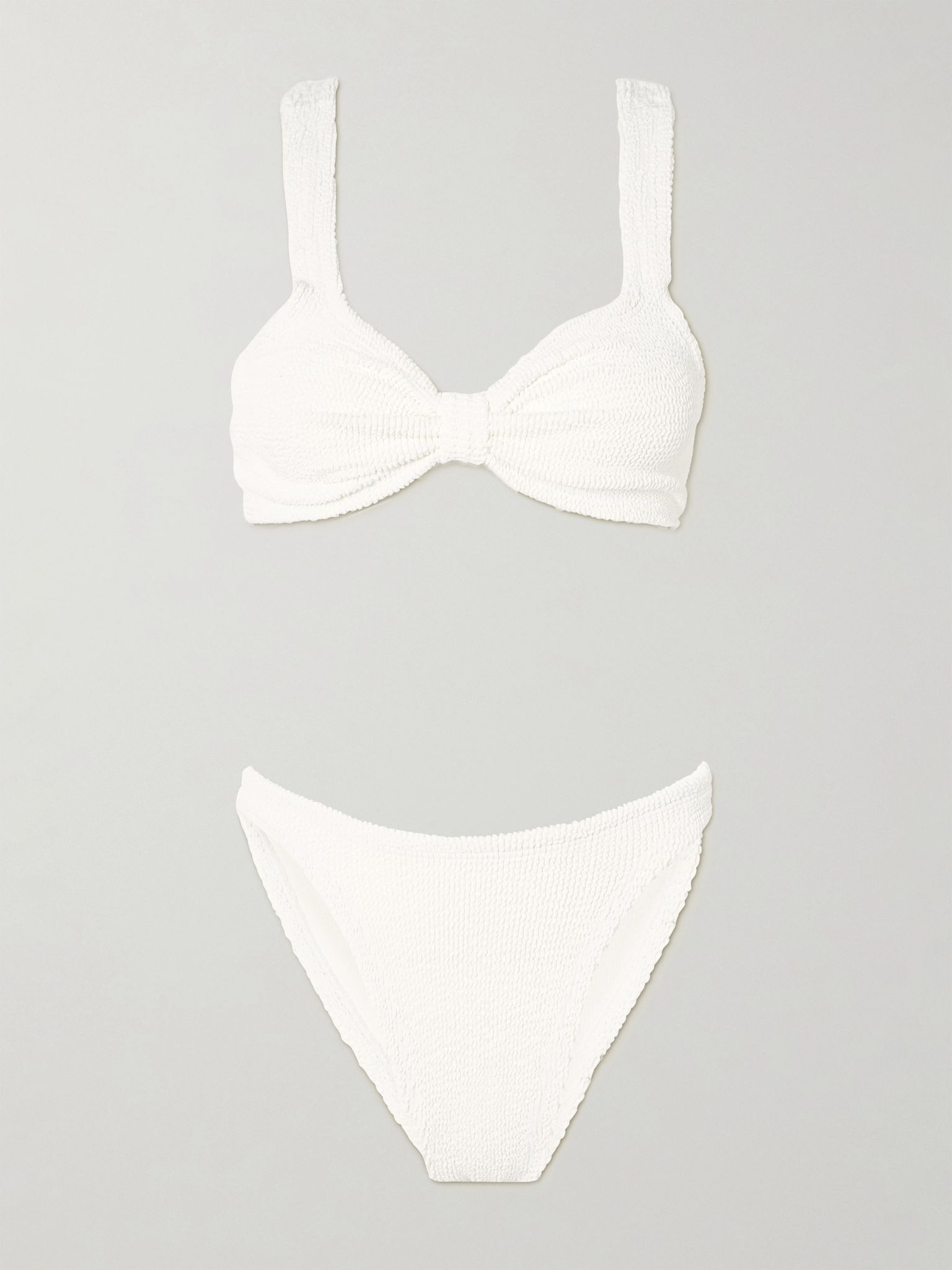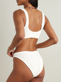 It's easy to spot Hunza G's swimwear at the beach - the brand's designs are made from its signature 'Crinkle™' seersucker, which was originally developed back in the '80s. This 'Bonnie' bikini has a gathered top with wide straps and matching briefs. Size & Fit - Comfortably fits those who are between a size XSmall-XXLarge - Mid-rise briefs with minimal coverage - Model is 177cm/ 5'10", bra size 32A and normally wears a size XSmall Model measurements: - Bust: 79cm/ 31” - Waist: 64cm/ 25” - Hip: 91cm/ 36” Details & Care - White seersucker - Slips on - 97% polyamide, 3% elastane - Lotion, sunscreen, oil and chlorine can cause discoloration of this item; this is not a manufacturing defect. Please follow care instructions to keep your swimwear in the best condition